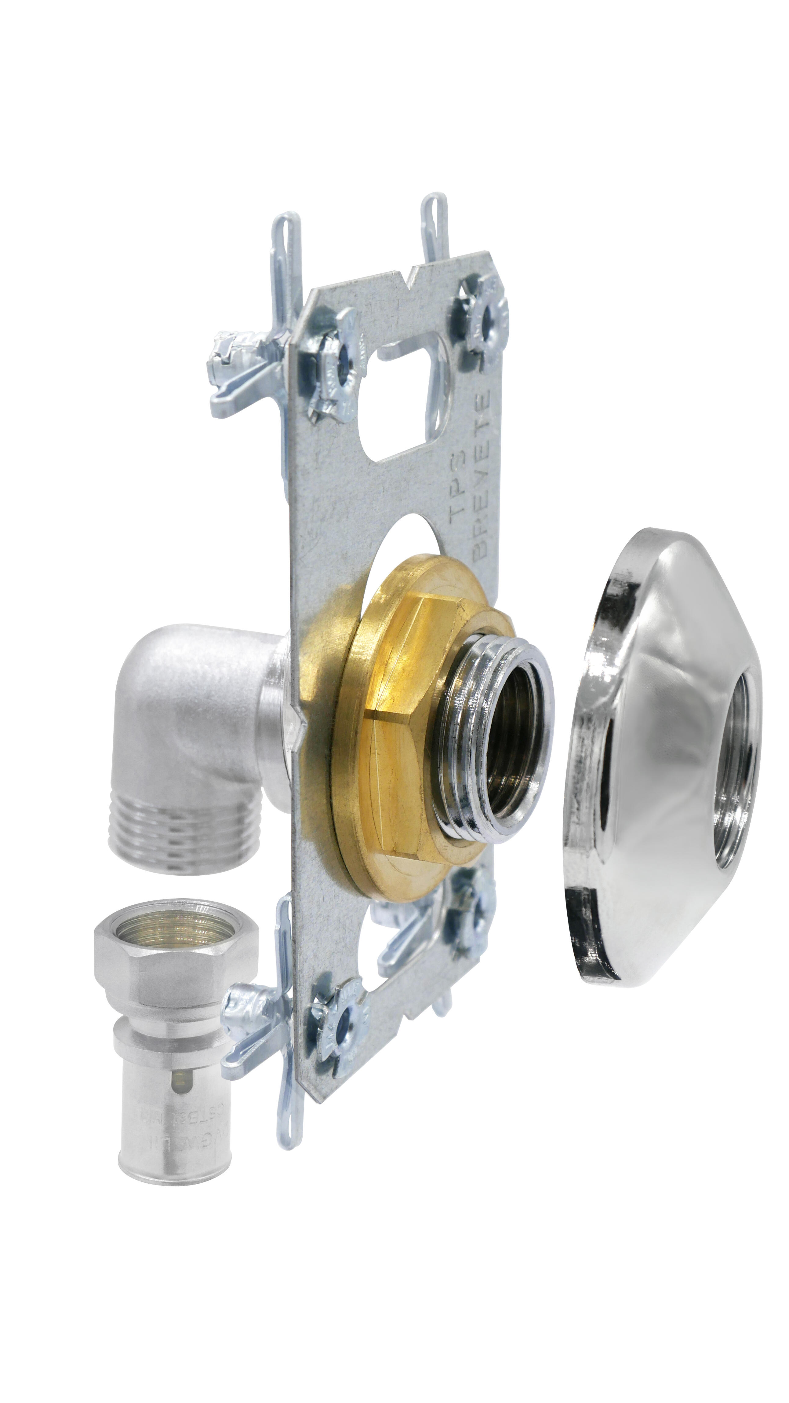 Système breveté garantissant fiabilité, rapidité et facilité de pose / Sortie femelle 1/2 (15x21) pour le raccordement direct d'un robinet de machine à laver / Platine métallique anti-arrachement / Réglage du raccord en profondeur grâce au système d'encoches