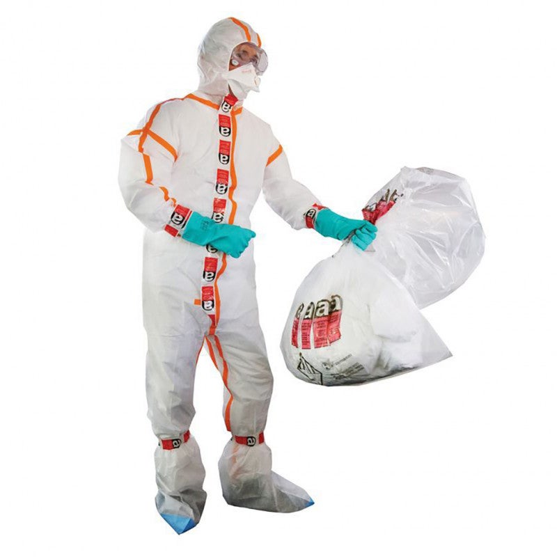 ○ 1 rouleau adhésif : 5 cm de large, imprimé logo règlementaire Amiante pour fermeture du sac à déchets et fixer les jonctions entre les accessoires et la combinaison. Résistant contre les variabilités de température.