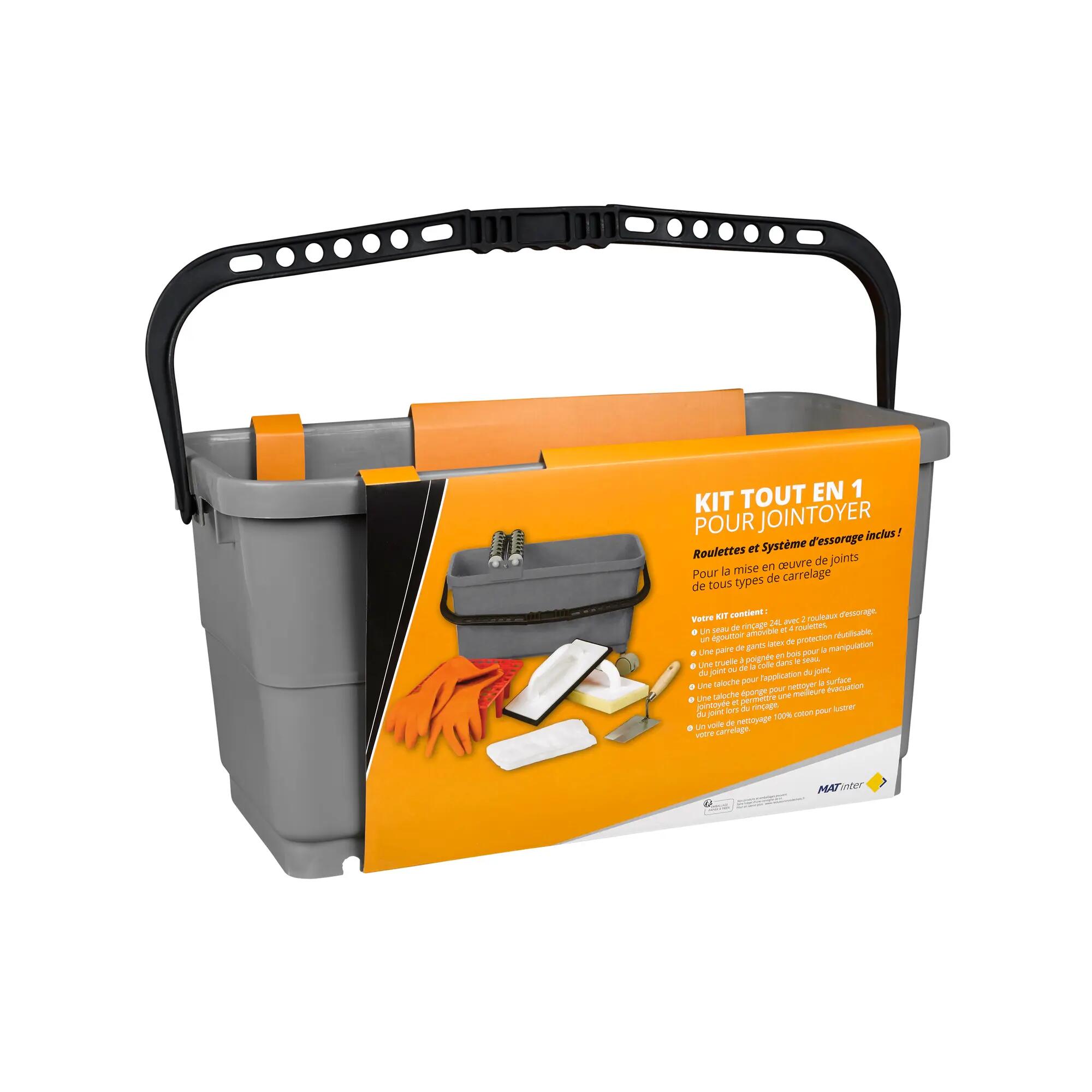 Kit joint EASY composé de : 1 seau de 24 litres avec roulettes 1 platoir à jointer (28x14x1cm) 1 platoir éponge de nettoyage 280x140x30mm rainuré pour un rincage et un nettoyage facile 1 truelle carrée acier carbone 14cm qui facilite l'application du joint 1 set de 2 rouleaux d'essorage amovibles 1 egouttoir (grille) amovible 1 gants 80% latex réutilisable 1 chiffon 100% coton pour une finition parfaite