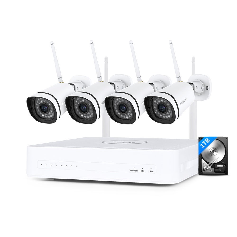 Kit de vidéosurveillance Wifi NVR 4 caméras FN8108W-B4-1T - FoscamCe kit de vidéosurveillance Foscam surveille en continu votre commerce, bureau ou habitat avec une visualisation à distance du flux vidéo depuis l'application Foscam sur smartphone, tablette ou PC. Ce pack complet protège les zones sensibles de toute intrusion grâce à sa détection humaine. L'enregistrement vidéo se déclenche automatiquement et une notification est envoyée par mail ou/et application en cas d'alerte détectée.Cet enregistreur Foscam propose différents mode d'enregistrement: Programmation d'heure, Détection de mouvement. Fourni avec 4 caméras Wifi et un disque dur 1T, il dispose de 8 canaux.Certifiées IP66, les caméras connectées FI9911W sont parfaitement adaptées pour un usage en extérieur, résistantes aux variations de températures. Equipée d'une puissante lentille IR, elles fournissent des images d'une excellente qualité 3MP sur un large champ de vision de 94°.De jour comme de nuit, elles restent opérationnelles avec une vision nocturne sur 20 m. La compression de flux vidéo H.264 + présente que des avantages en terme de stockage et d'économie de bande passante, avec un aperçu vidéo de haute qualité et un enregistrement à faible débit binaire.Pré-appairées, les caméras se connectent en Wifi à l'enregistreur NVR FN8108W. Cet enregistreur possède une capacité d'accueil de disque dur allant jusqu'à 8 To complété par 2 ports USB.La solution Auto-bridge ou ""Mesh"" permet de connecter en série les caméras, elles se connectent entre elles afin de bénéficier d'un signal Wifi plus puissant à proximité.Avec ce kit NVR Foscam, vous pouvez profiter d'un accès 24h / 24 et 7j / 7. En vacances ou au travail, vous visualisez vos caméras en temps réel, lisez les enregistrements vidéo, recevez des alertes... directement depuis votre smartphone ou tablette, en utilisant l'application gratuite Foscam.(prend en charge iOS et Android).