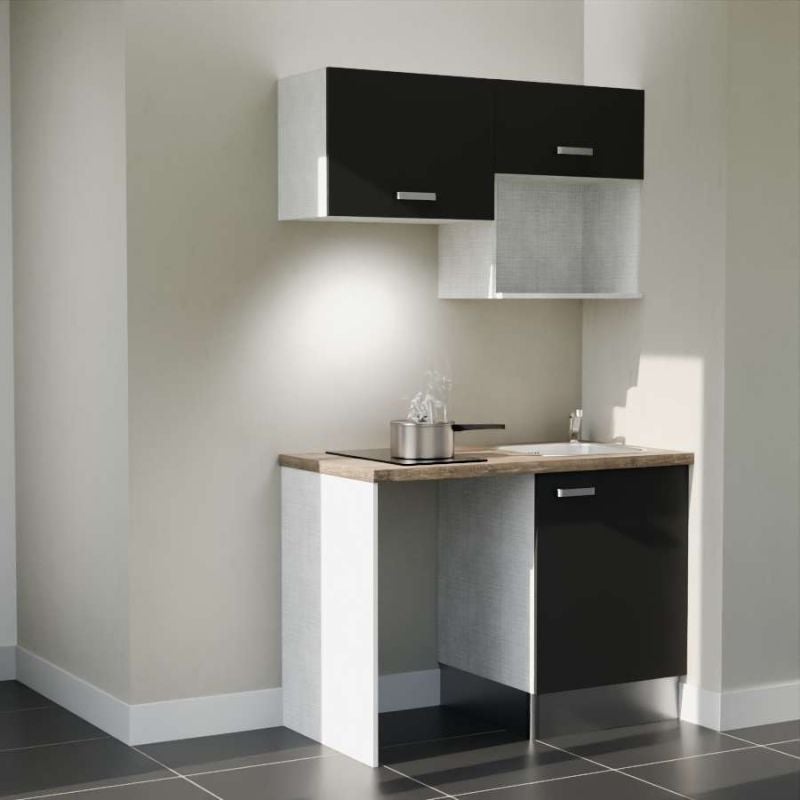 Kitchenette K02L-PT - 120 cm avec plan de travail et évier - Façade Noir - Plan Bois - Evier Inox - Crédences Non