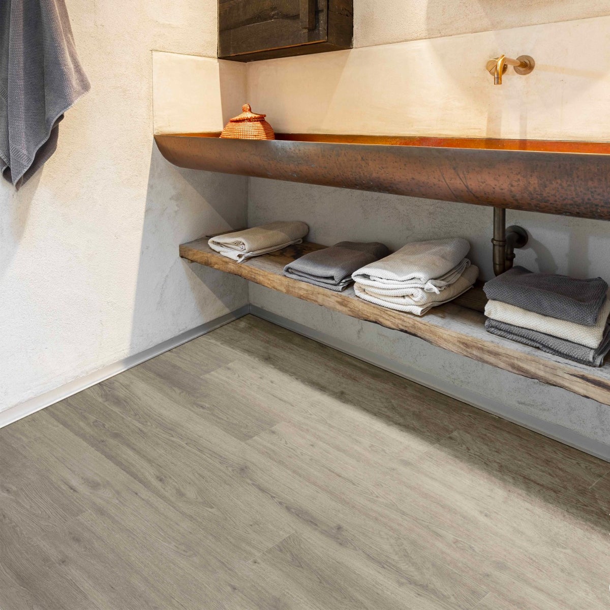 Sol souple imitation parquet, aux allures modernes.