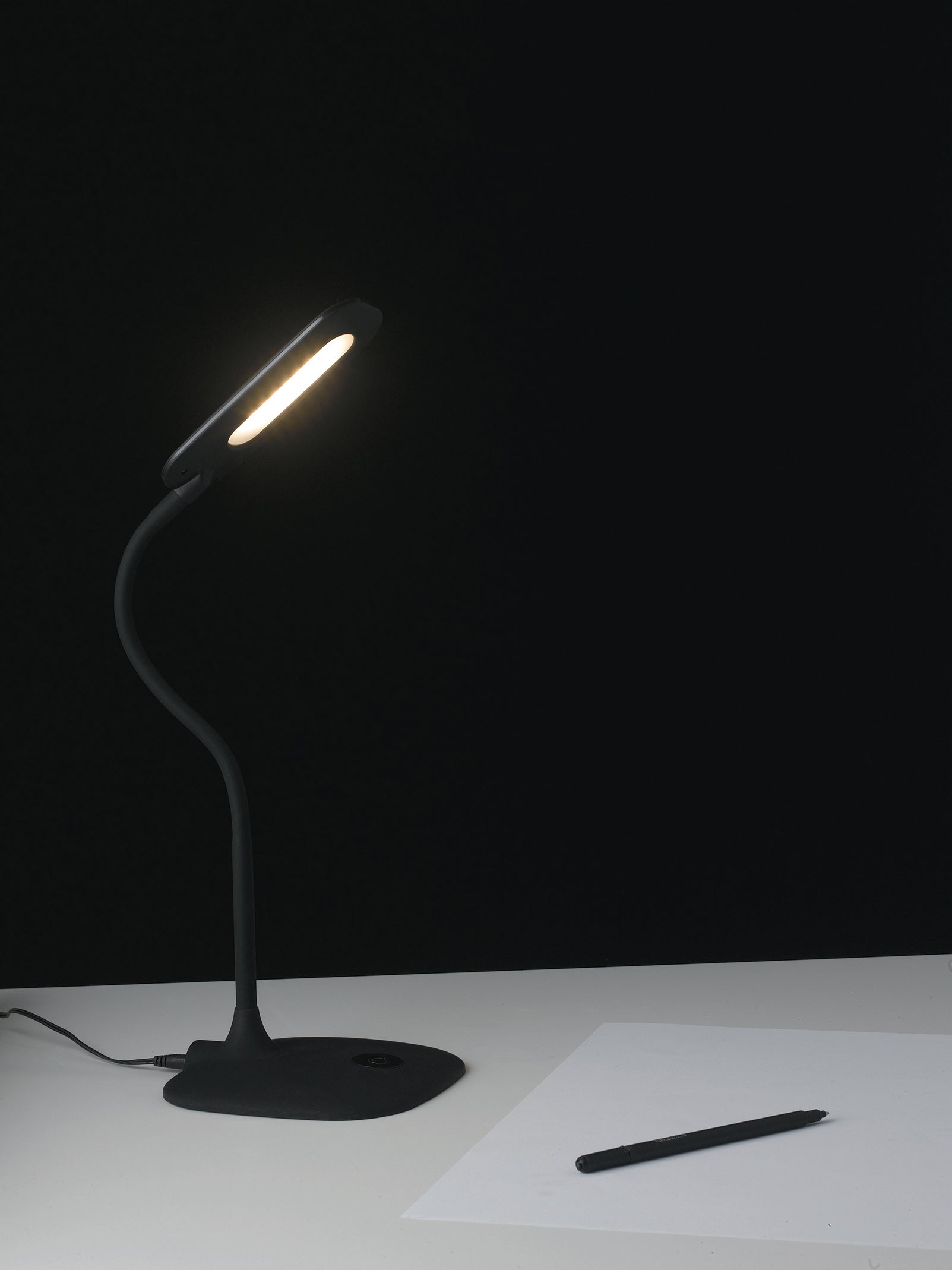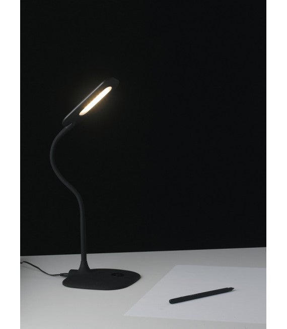 "Lampe de lecture LED en métal recouvert de silicone avec tête et bras orientables disponibles en versions blanc, noir et gris. Equipée d'une base pratique pour une installation murale."