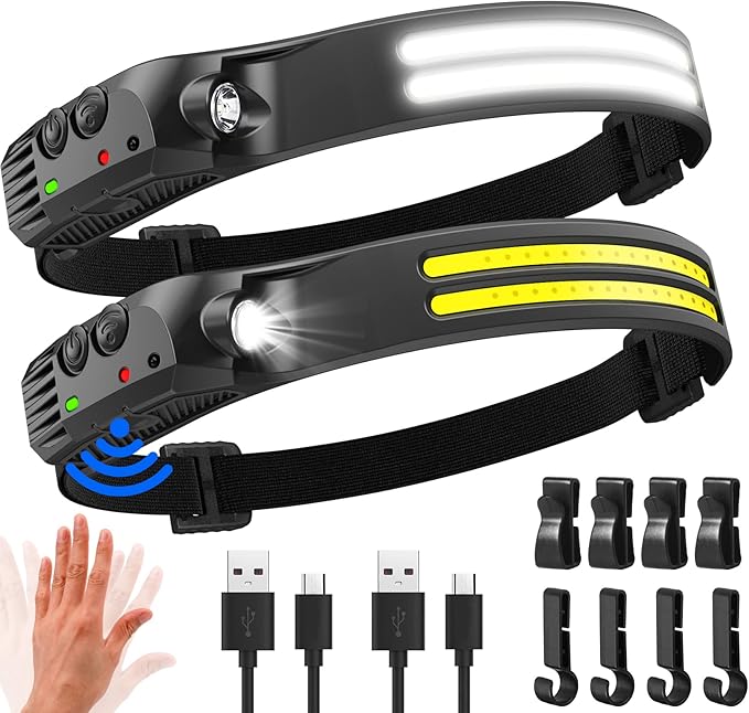 【5 FOIS PLUS LUMINEUX QUE LES AUTRES LAMPES FRONTALES AVEC MODE 【DÉTECTEUR DE MOUVEMENT】 - La lampe frontale a une luminosité maximale de 2000 lumens et une portée d'éclairage de 100 à 300 m². La batterie intégrée de 1500 mAh peut durer de 3 à 8 heures après une charge complète. En mode capteur, la lampe frontale s'allume automatiquement lorsque des objets s'approchent de vous. Vous pouvez le contrôler en agitant votre main devant d'autres objets. 【6 MODES D'ÉCLAIRAGE POUR TOUS LES SCÉNARIOS, LONGUE DURÉE DE VIE ET LÉGER】- Appuyez sur le bouton d'alimentation pour passer d'un mode à l'autre : lumière COB haute, lumière COB basse, XPE haute, XPE basse, mode stroboscopique, détecteur de mouvement. Appuyez longuement sur le bouton d'alimentation pour passer en mode stroboscopique, puis les lumières XPE et COB clignoteront en même temps. Sa petite taille permet de le plier et de le ranger facilement dans une poche. 【IPX5 ÉTANCHE ET RECHARGEABLE PAR USB】- La lampe frontale est étanche selon la norme IPX5, ce qui empêche les éclaboussures d'eau sous tous les angles. Vous n'avez pas à vous inquiéter s'il pleut ou neige soudainement. Il est idéal pour les amateurs de plein air comme équipement de camping. Grâce à son câble de charge Type-C inclus, notre lampe frontale rechargeable est rechargeable et ne nécessite pas de batterie. 3 heures de charge permettent jusqu'à 8 heures d'autonomie !