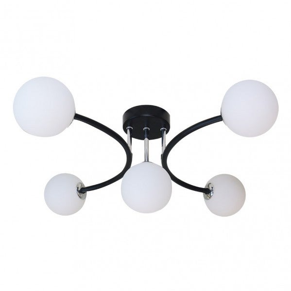 Lampe à cinq lumières de la série LA HAVANA de couleur NEGRE/CHROME avec des tulipes de couleur blanche. Design original et moderne avec un corps en métal et des tulipes de cristal blanc.