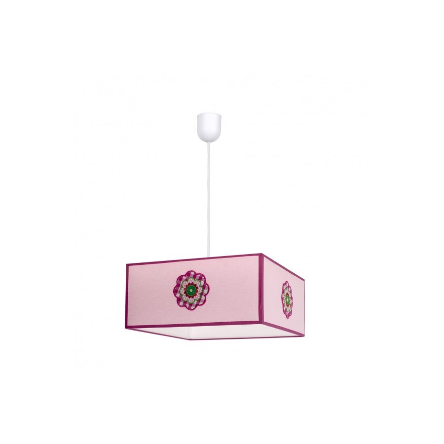 Le modèle de lampe de plafond pendentif Petal de FABRILAMP est fait de textile blanc/rose, son design se distingue par sa forme carrée et une broderie en forme de fleur. Il a un support de lampe E27.