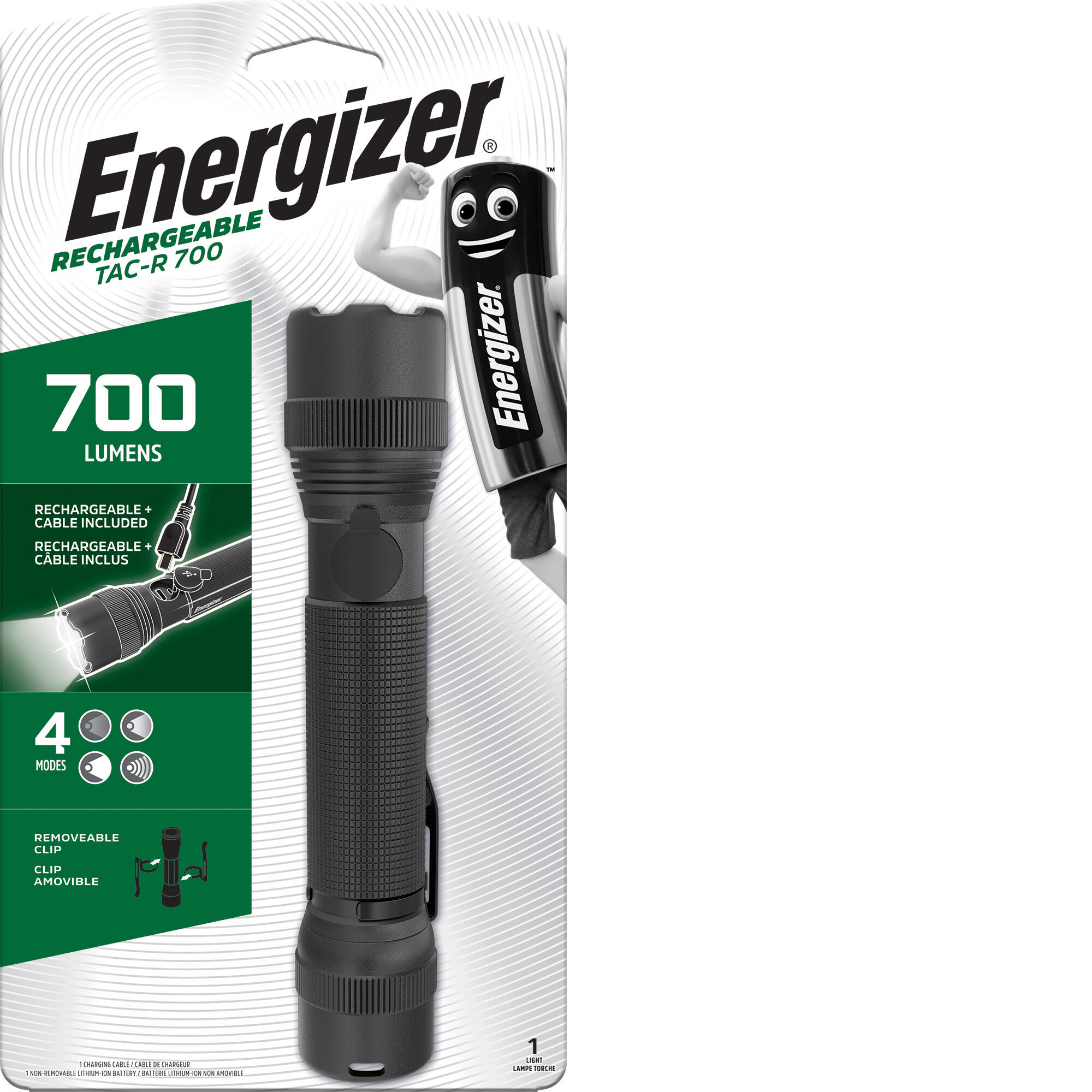Lampe torche super lumineuse : Cette lampe torche rechargeable à LED de 700 lumens offre une luminosité exceptionnelle et des performances élevées, vous permettant de voir jusqu'à 100 mètres 4 modes d'éclairage Choisissez le mode d'éclairage parfait pour votre activité, en choisissant entre haut, moyen, bas et stroboscope d'urgence. Légère : gardez cette lampe torche puissante et compacte dans votre tiroir, votre voiture, votre trousse d'urgence à domicile ou transportez-la dans votre sac. Construction durable : le corps en aluminium de qualité aéronautique robuste et la construction étanche IPX4 offrent une protection contre les dommages et les éclaboussures. Heures d'autonomie : Cette la lampe torche portable puissante peut briller jusqu'à 35 heures en mode bas Technologie MAX-VIZ digne de confiance : La puissante technologie d'Energizer reproduit la lumière du jour pour une vision haute définition sur laquelle vous pouvez compter