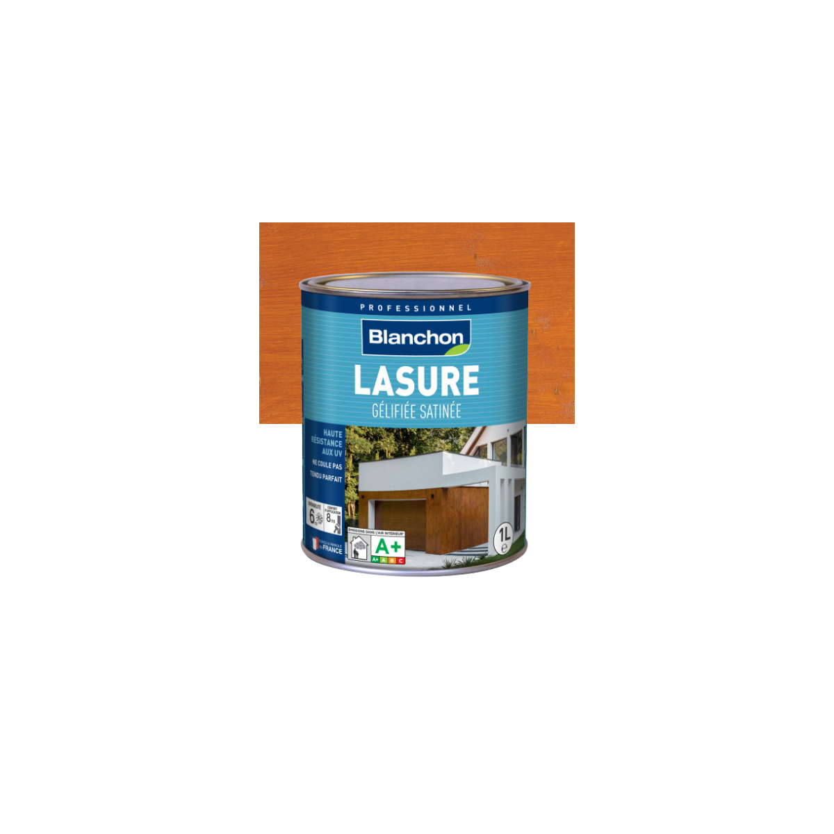 Préparation du support avant application- Le bois doit être propre, sec et en bon état, sans vernis, peinture ou huile.- Ponçage recommandé avec un abrasif grain 80 pour une meilleure adhérence.- Sur bois résineux ou exotiques, dégraisser avec de l'acétone.- Application possible sur bois neuf, bois déjà lasuré (après égrenage) ou bois ancien préalablement décapé.Application de la Lasure gélifiée 1L chene doré satinée- Produit prêt à l'emploi, ne pas diluer. Bien agiter avant usage.- Température d'application : supérieure à 12°C, humidité inférieure à 85%.- Application en 3 couches généreuses avec pinceau, brosse ou pistolet.- Ponçage léger entre les couches (grain 100-120) pour un rendu optimal.- Ne pas appliquer sur un bois dont l'humidité dépasse 12%.Conseils pour une protection optimale- Sur boiseries extérieures très exposées (Sud ou Ouest), appliquer 3 couches pour une protection renforcée.- Pour prolonger la durabilité, pré-appliquer une couche de CONDITIONNEUR® ANTI-UV BLANCHON.- Conformément à la norme NF T34-202, l'utilisation en extérieur de la teinte incolore doit être complétée par 2 couches de lasure teintée.Pourquoi choisir la Lasure gélifiée 1L chene doré satinée ?- Facilité d'application : texture gélifiée limitant les coulures.- Protection longue durée : formule résistante aux UV et aux intempéries.- Polyvalence : adaptée aux bois intérieurs et extérieurs.- Finition satinée : aspect naturel et mise en valeur du veinage du bois.Optez pour la Lasure gélifiée 1L chene doré satinée pour une protection et une esthétique optimales de vos boiseries. Commandez-la dès maintenant pour un rendu professionnel et durable !