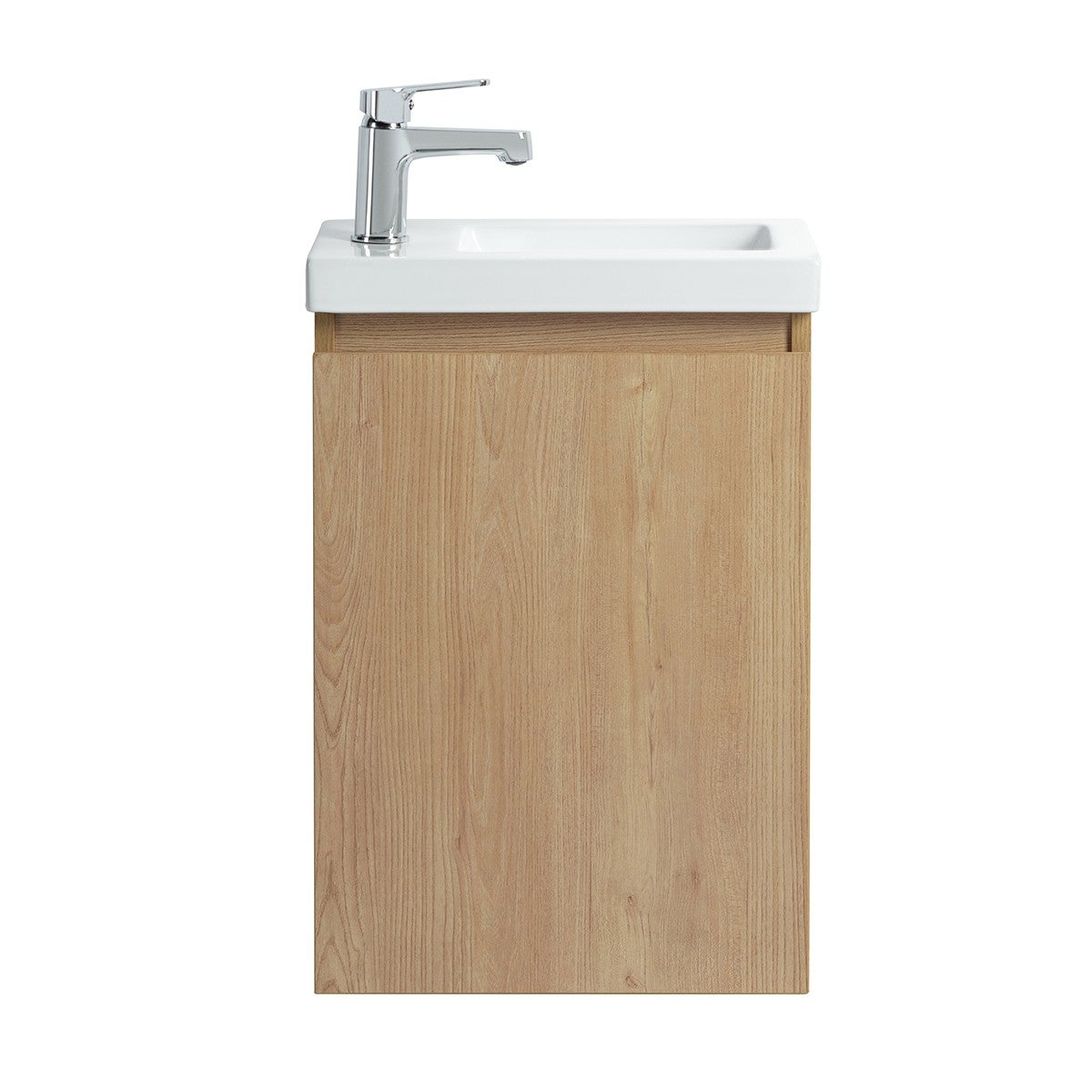 Optimisez l'espace de vos WC avec le lave-mains compact BILY CT040-1P-04. Moins de 40 cm de large et 22 cm de profondeur, voici des dimensions record pour se laver les mains avec un minimum d'encombrement. Le lave-mains est livré avec une vasque céramique accompagnée d'un meuble effet bois en mélaminé (PPSM). Le gain de place est renforcé par l'absence de poignée : le chanfrein vous sert à ouvrir la porte. Le lave-mains pour WC BILY CT040-1P-04 arbore un design moderne et épuré, il s'intègre facilement dans la décoration actuelle de vos toilettes. L'effet bois est une touche de décoration appréciable qui se différencie du blanc omniprésent dans les meubles de WC et salle de bain.