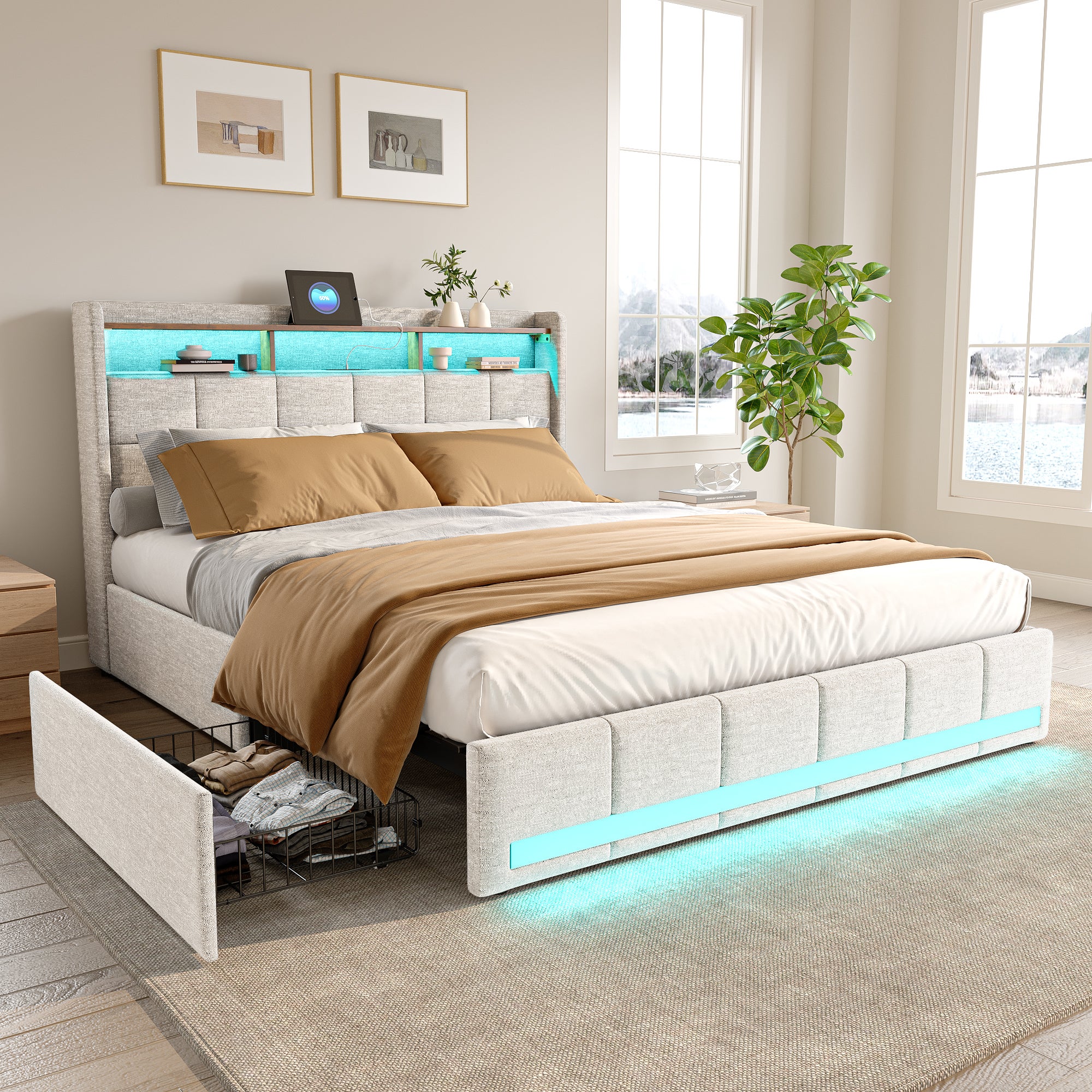 Lit 140x190 cm avec sommier éclairage LED et USB, 4 tiroirs et tête de lit de Rangement, Lin, Beige