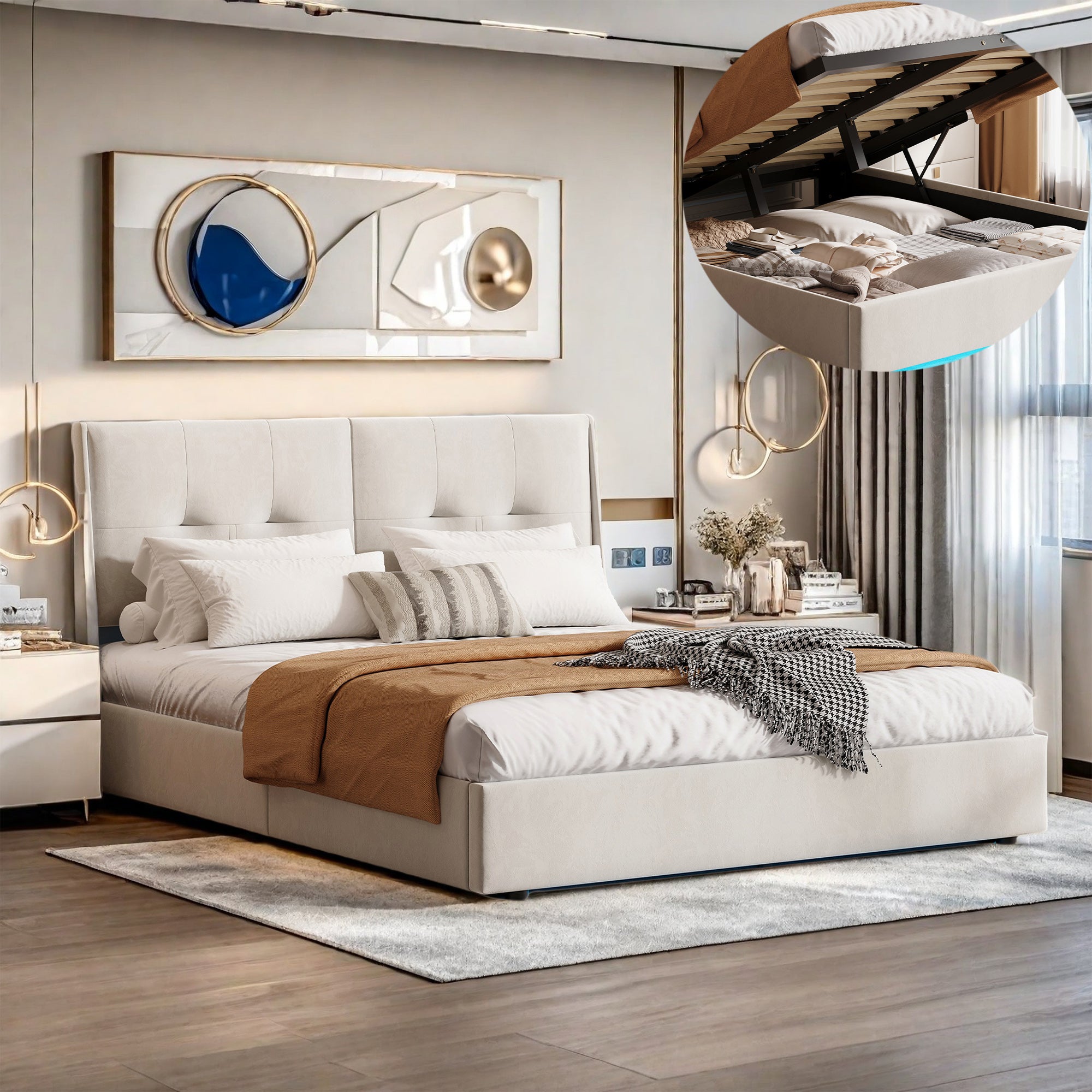 Lit coffre 160x200 cm avec LED, cadre de lit double avec sommier à lattes, tissu en velours, lit adulte, 160x200 cm, beige