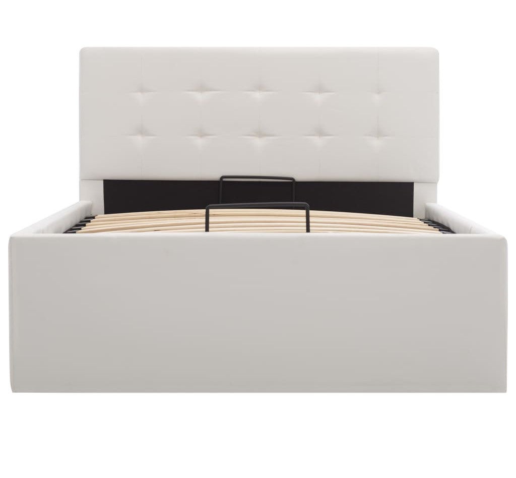 Très pratique, ce splendide lit coffre 140x200 cm à coffre sera parfait pour apporter une touche d'originalité à votre chambre. Sa structure en bois multipli et métal est recouverte de simili cuir de très bonne qualité, et son sommier relevable par une mécanisme de levage à gaz hydraulique facile révèle un coffre vous offrant un bel espace de rangement. Couchage 90 x 200 cm - L 98 x H 73 x P 211 cm Couleur : blanc Matériau : tapisserie en similicuir + lattes en contreplaqué + cadre en acier et MDF Dimensions du matelas correspondant : 90 x 200 cm matelas non inclus Avec un compartiment de stockage Mécanisme de levage à gaz hydraulique facile Garantie 2 ans