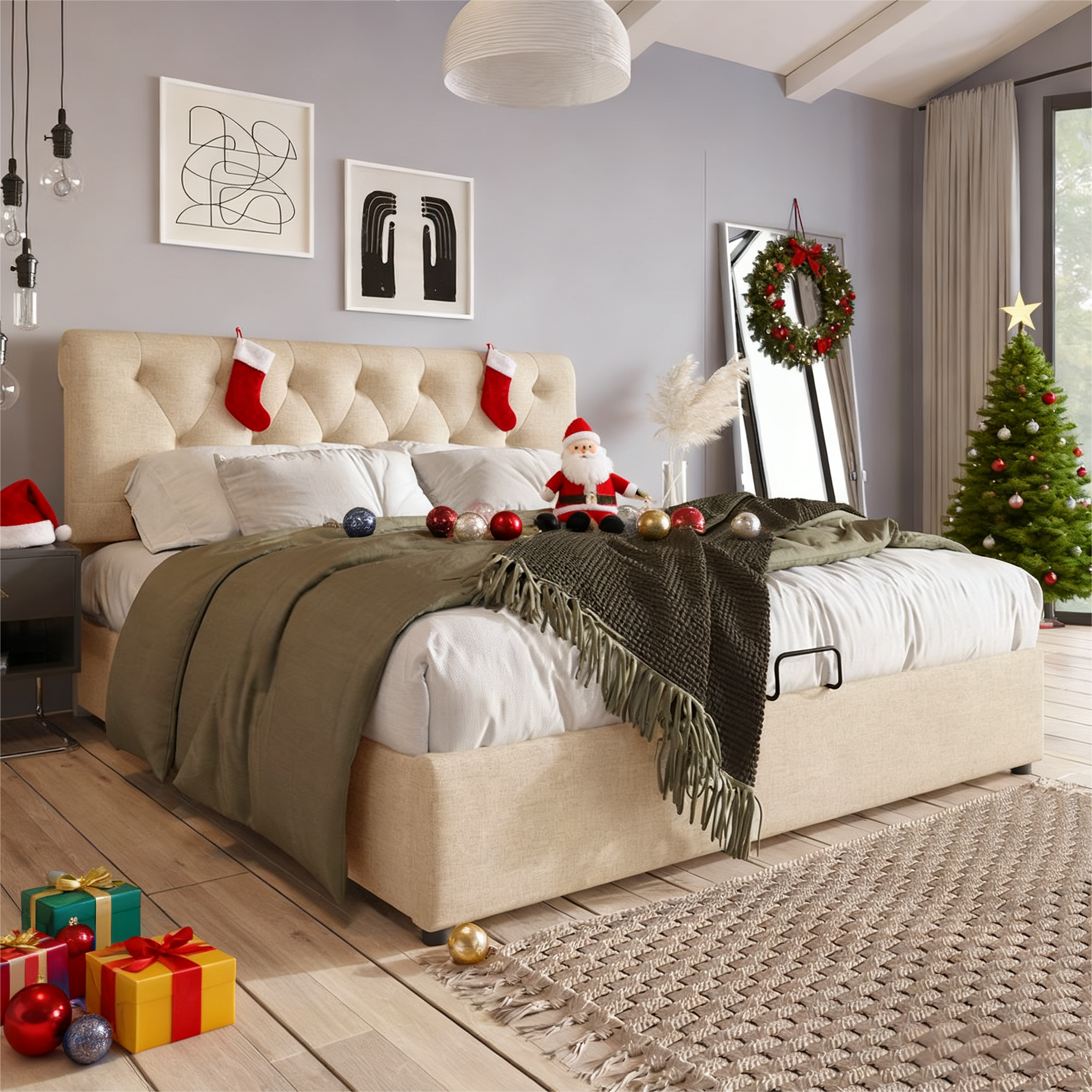 Grand coffre de lit sous le sommier relevable avec beaucoup d'espace de rangement pour ranger les couvertures, les oreillers ou le linge de lit, sommier facilement relevable grâce au vérin de levage. A l'intérieur, un espace de 156x195 cm est prévu, Une toile Oxford est fixée sur le dessous du lit pour éviter la poussière.