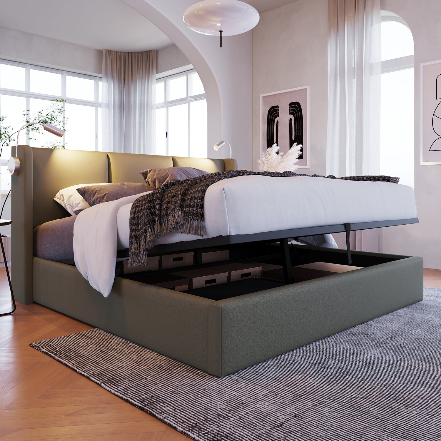 √ Barre hydraulique-Très grand espace de rangement Grand coffre de lit sous le sommier relevable avec beaucoup d'espace de rangement pour les couvertures, les oreillers ou les draps, sommier facilement relevable grâce au vérin de levage. Une toile Oxford est fixée sur le dessous du lit pour éviter la poussière.