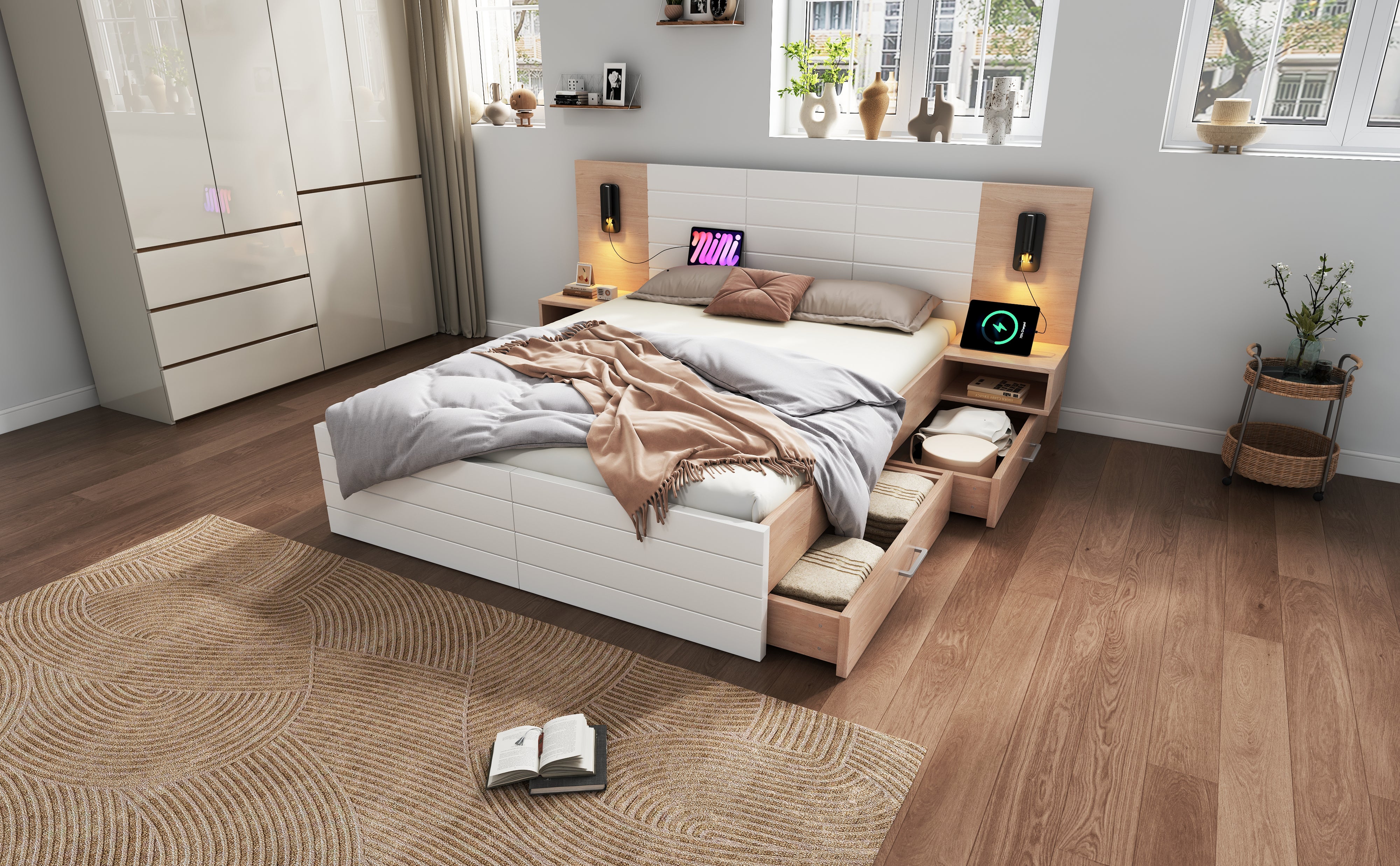 - Répond à divers besoins de rangement : les deux tables de chevet vous permettent de ranger facilement les objets fréquemment utilisés tels que les lunettes, les livres, les téléphones portables, etc. Sous le lit, vous trouverez un grand espace de rangement pour les objets volumineux tels que les valises et les boîtes. Il y a deux tiroirs mesurant 90 x 68 x 10 cm (longueur x hauteur x largeur). Vous pouvez placer les tiroirs à gauche ou à droite du lit, selon la décoration de votre chambre et vos habitudes d'utilisation.