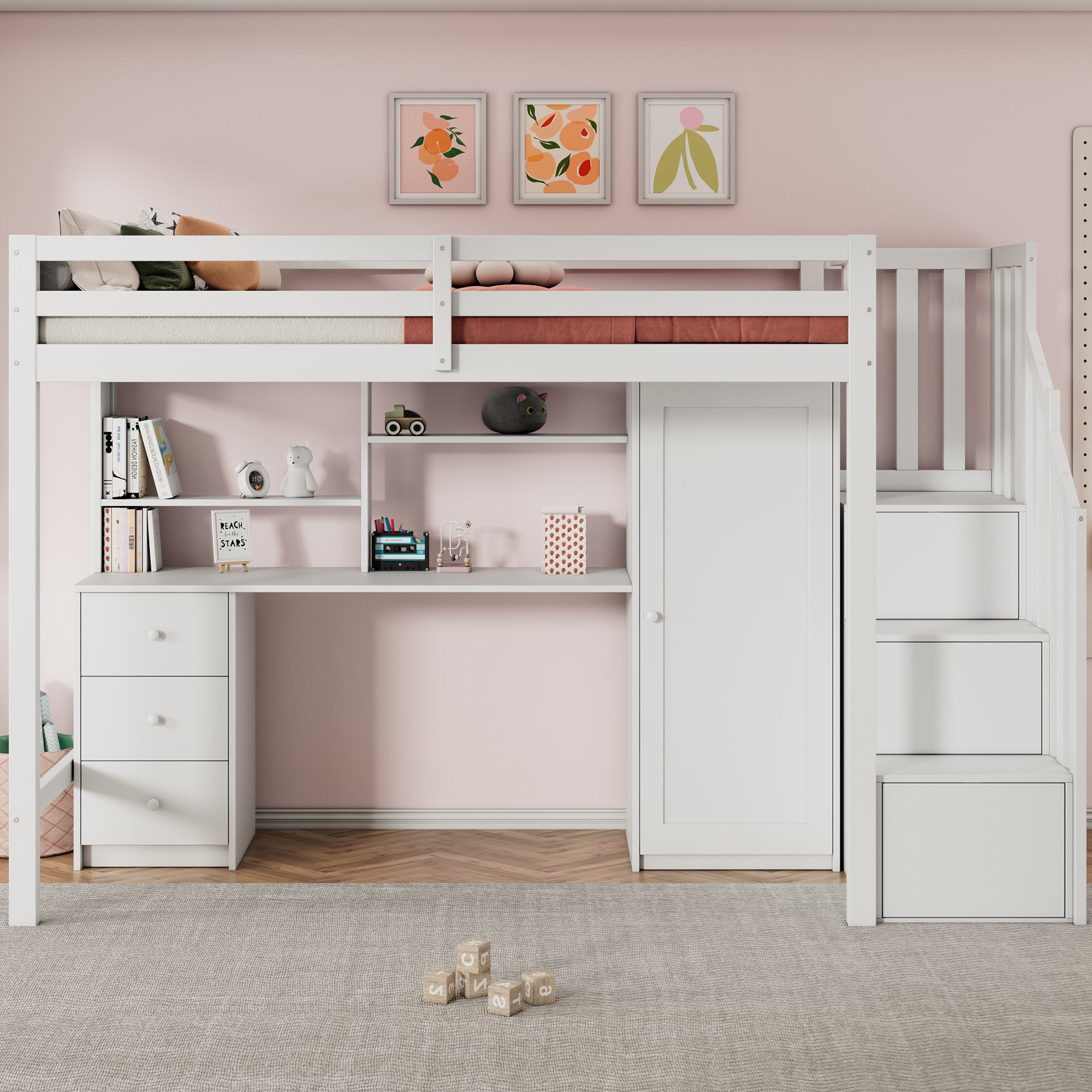 Lit mezzanine 90 x 200 cm avec tiroirs, Lit superposé en bois avec bureau et armoire, escalier, sommier à lattes, blanc (sans Matelas)