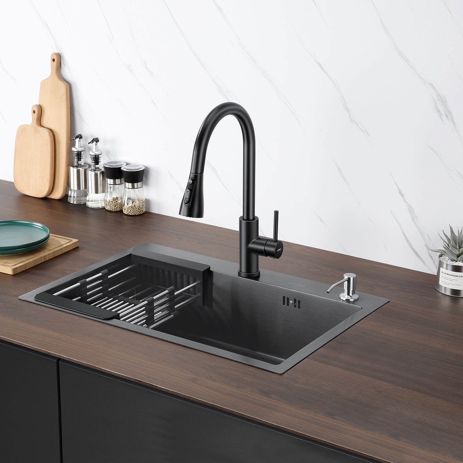 Lonheo Max Évier Cuisine 1 Bac 68x45x19CM Évier à Encastrer en Acier Inox 201 avec Distrubuteur de savon et Égouttoir panier, Noir,EU Modèle