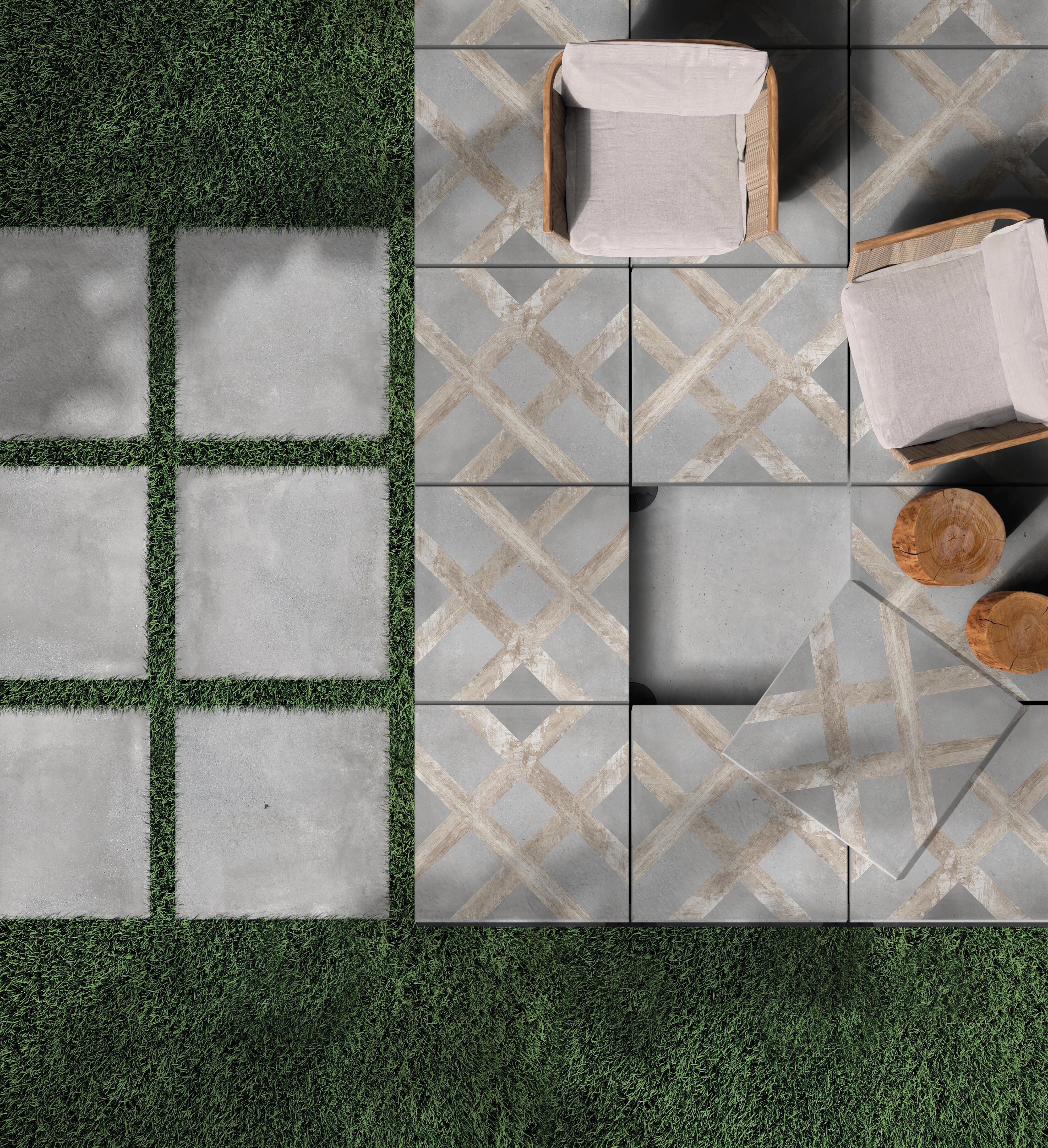 Pour les environnements extérieurs, avec sa résistance au glissement classe R11, son graphisme est composé de matériaux d'inspiration différente, ce qui rend cet article très flexible et adaptable à tout type de mobilier d'extérieur.