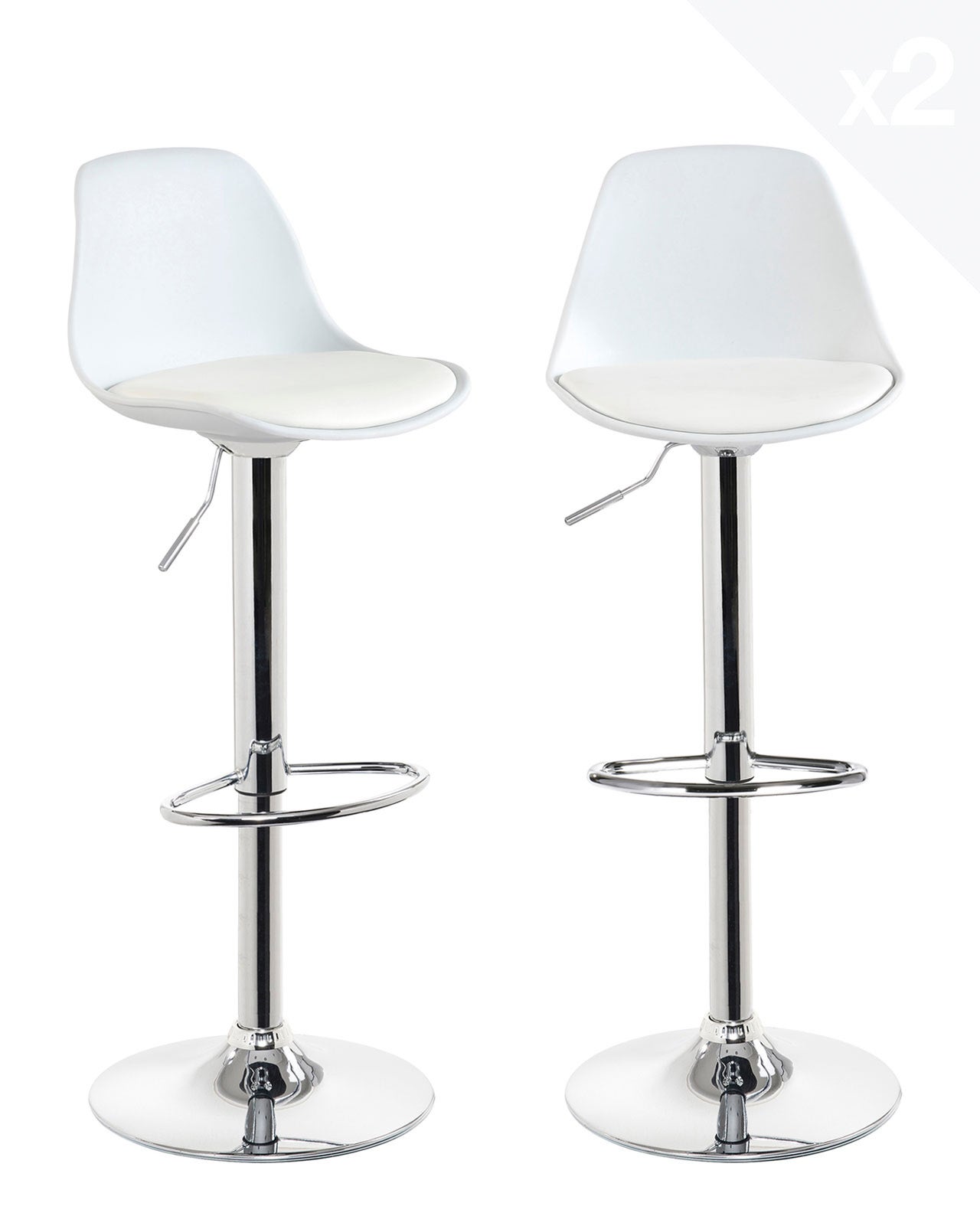 Lot 2 tabourets de bar design, siège petit dossier coussin simili cuir, pivotant, hauteur réglable, pied chrome SIG (blanc)