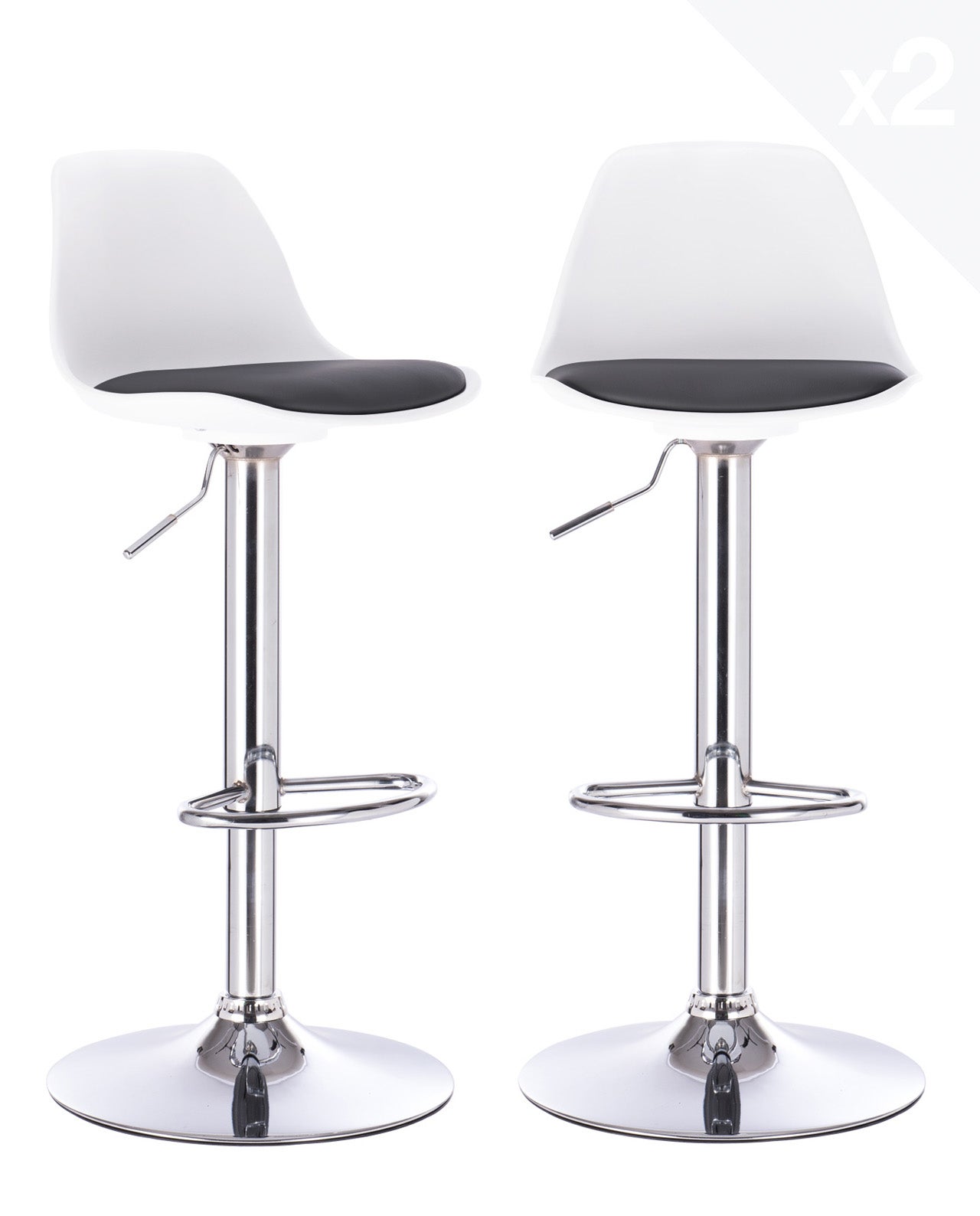 Lot 2 tabourets de bar design, siège petit dossier coussin simili cuir, pivotant, hauteur réglable, pied chrome SIG (blanc noir)
