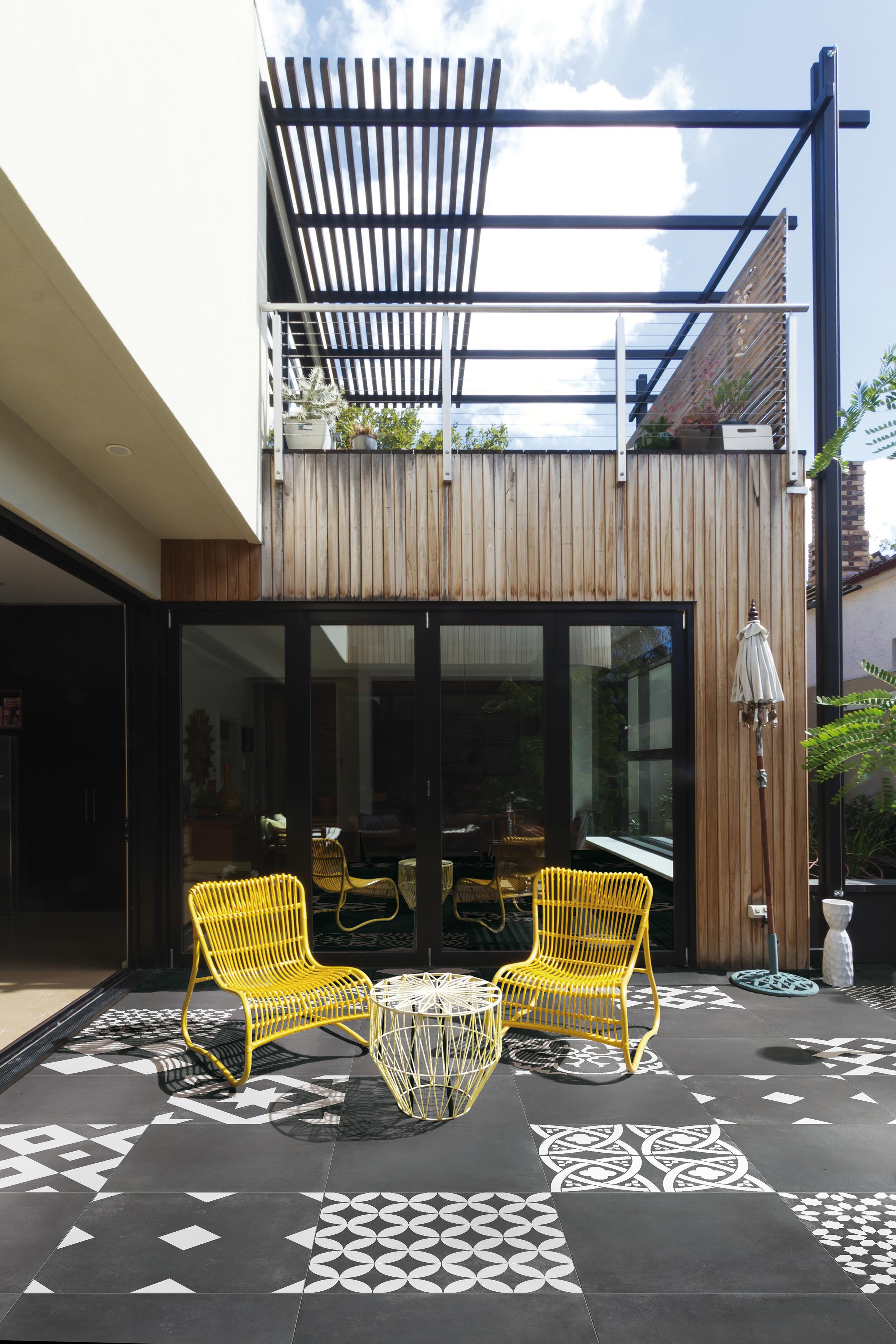 Pour les environnements extérieurs, avec sa résistance au glissement classe R12, la composition mono-décor facilite son installation, en termes d'esthétique, grâce aussi à l'élégance de l'alternance noir et blanc.