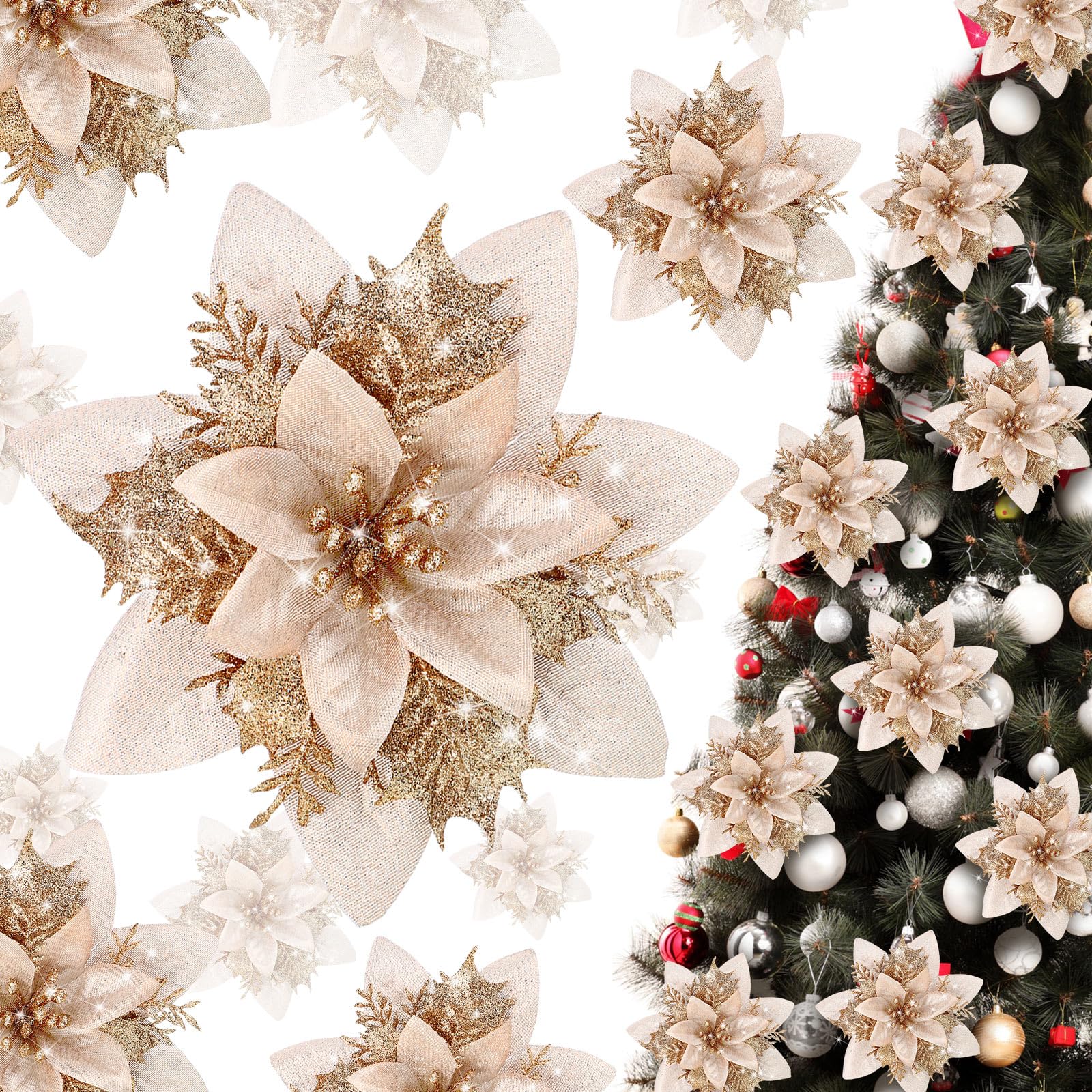 Lot de 10 décorations de Noël, fleurs artificielles scintillantes avec clips, décorations pour sapin de Noël, pendentifs de fleurs artificielles