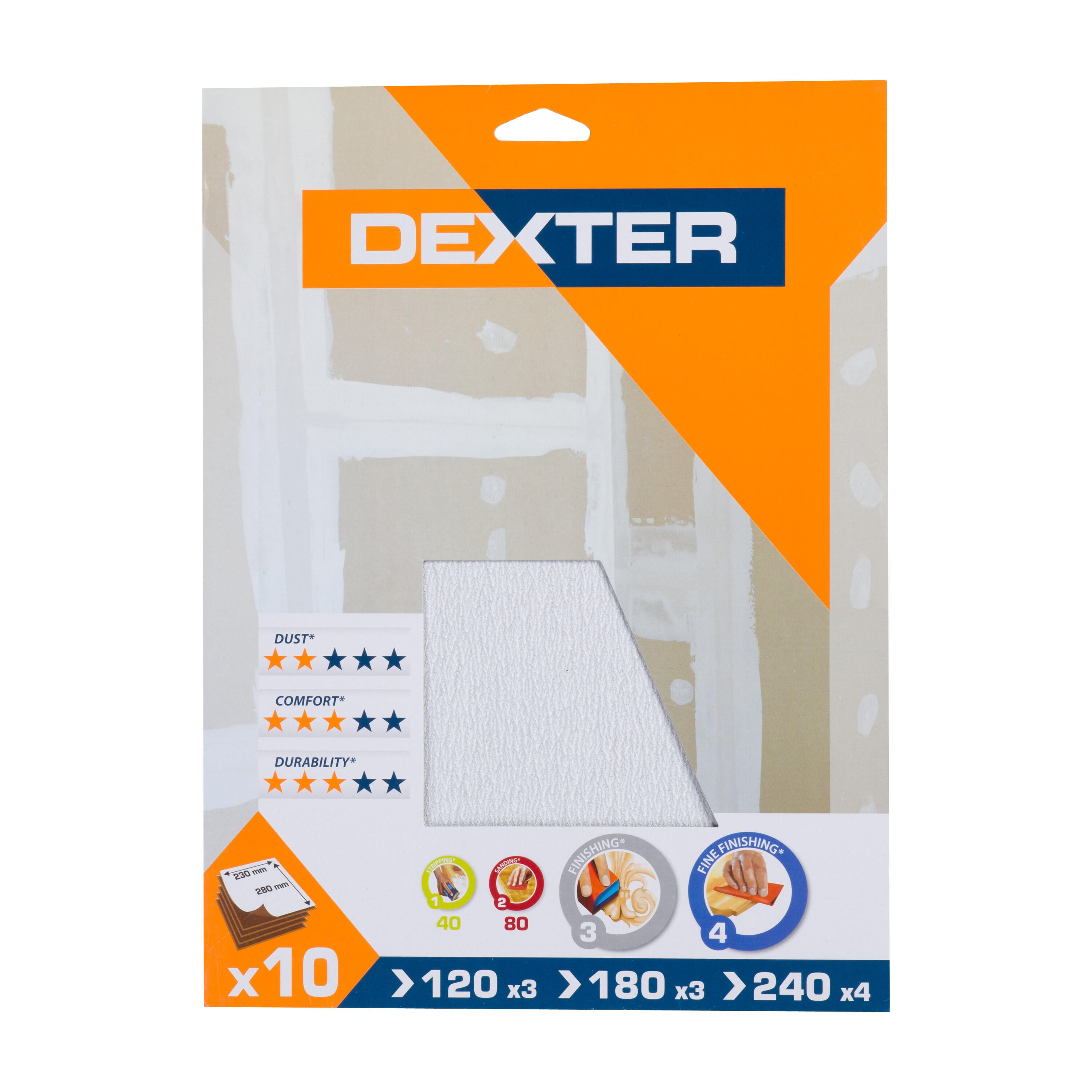 Lot de 10 feuilles abrasives DEXTER pour multiponceuse, grains 4x240,3x180,3x120