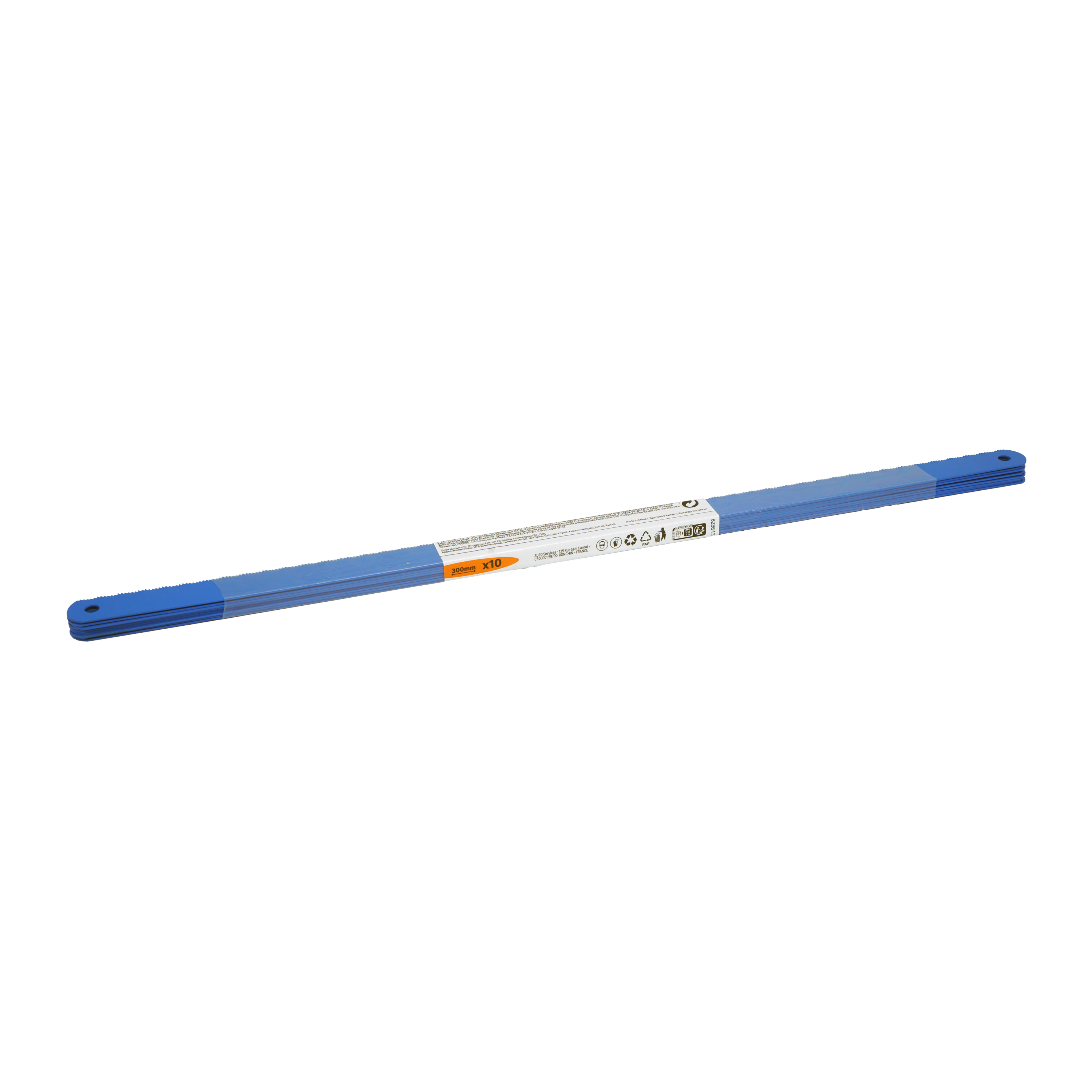 Paquet de 10 lames d'arc de scie en acier. Il possède 24 dents par pouce. Ils ont une coupe standard. Indiqué pour couper les métaux. Offre 3 ans de garantie. Mesures de chaque feuille : 30 cm de long.