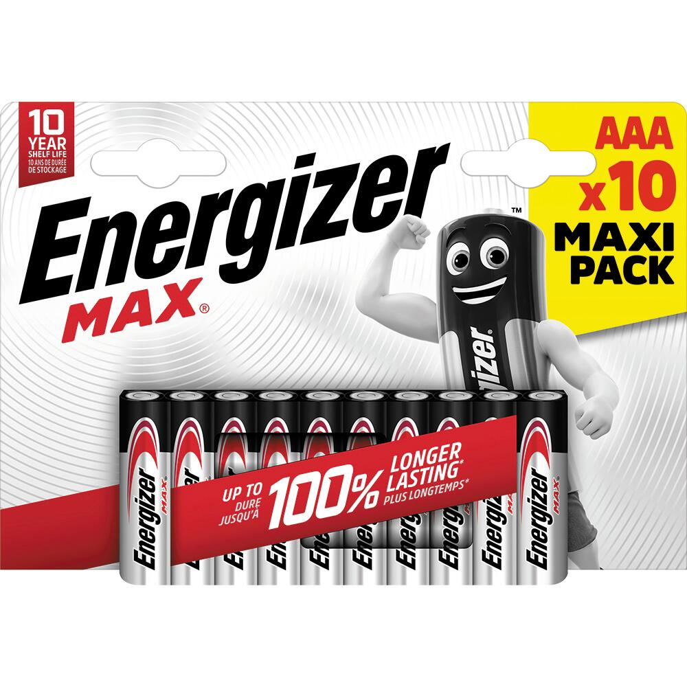 Piles alcaline Max Energizer AAA blister de 10 conservent leur énergie pendant 10 ans dans leur emballage et protègent vos appareils avec la garantie zero coulure pour un usage fiable de vos appareils du quotidien