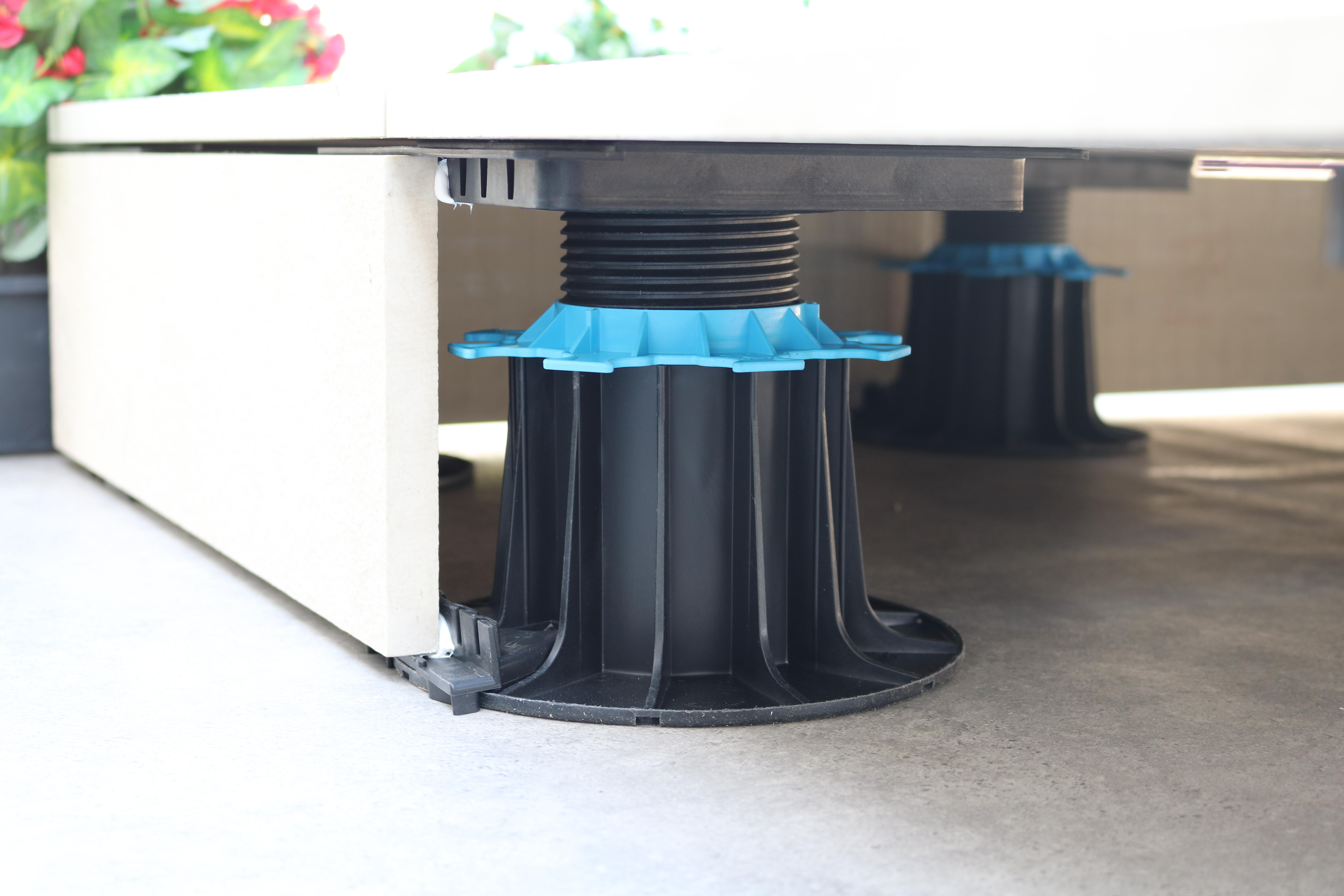 Support permettant la finition latérale d'une terrasse (dalles ou bois) sur plots en créant une contremarche.