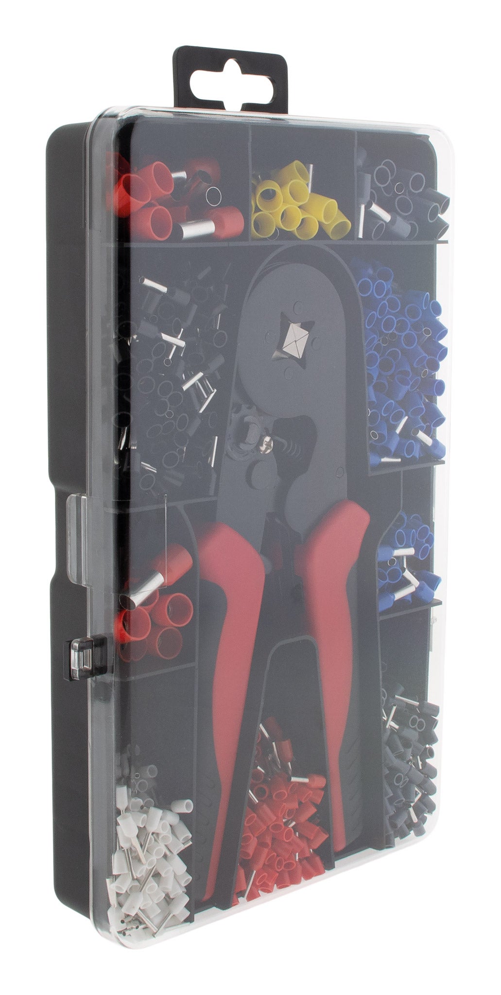 Pince à sertir, pour cosses de 0,25 à 10mm², adaptable grâce à une mollette réglable. Parfaite pour assurer un sertissage complet et sécurisant., 1200 cosses de longueurs de 8 à 12mm, pour des fils de section de 0,5 à 10mm². Les compartiments facilitent le rangement des 8 types de cosses avec codes couleurs.