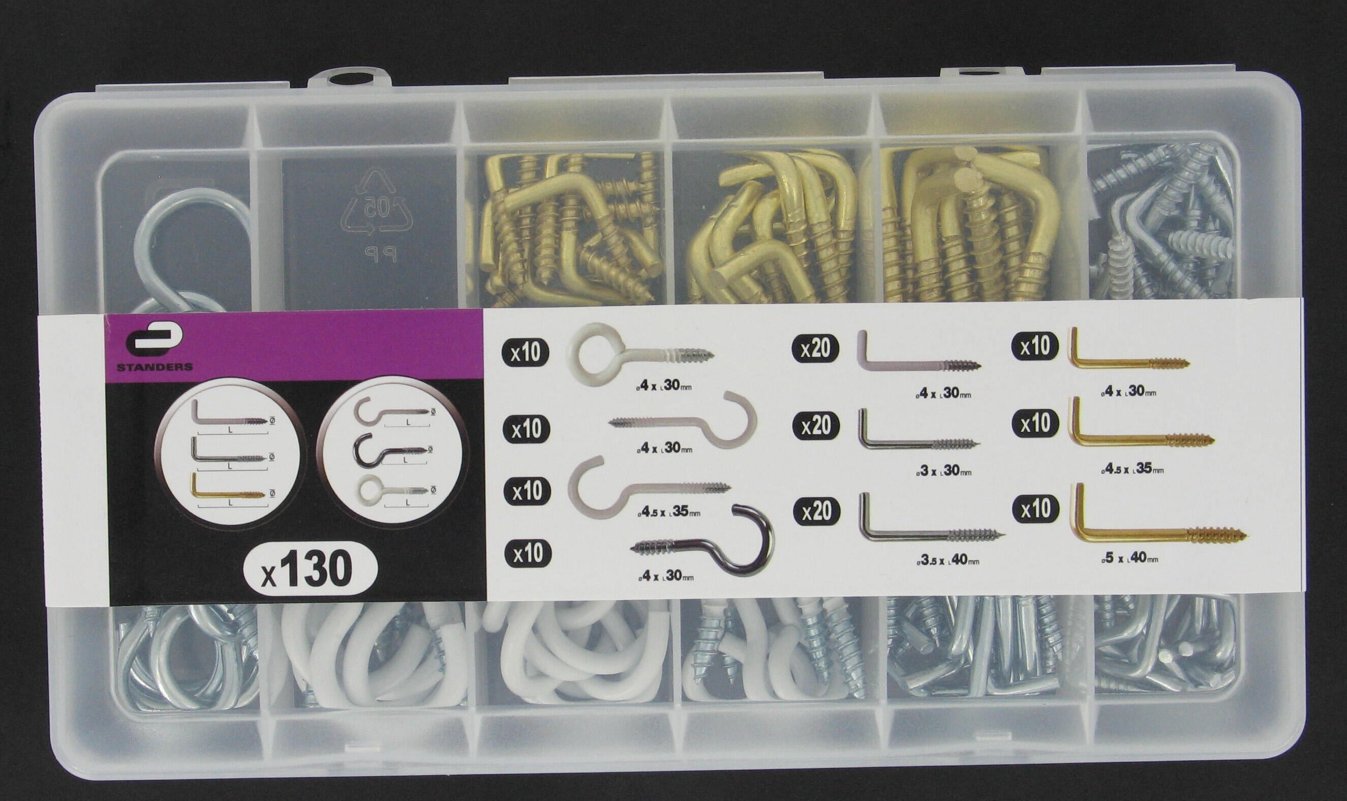 Mallette avec 130 douilles et crochets assortis. 10 œillets blancs fermés 4x30 mm ; 10 œillets blancs ouverts 4x30 mm ; 10 œillets ouverts blancs 4,5x35 mm ; 20 pointes blanches 4x30 mm ; 20 pointes en zinc 3x30 mm ; 20 pointes en zinc 3,5x40 mm ; 10 pointes en zinc 4x30 mm ; 10 pointes en laiton 4x30 mm ; 10 crochets en laiton 4,5x35 mm ; 10 pointes en laiton 5x40 mm