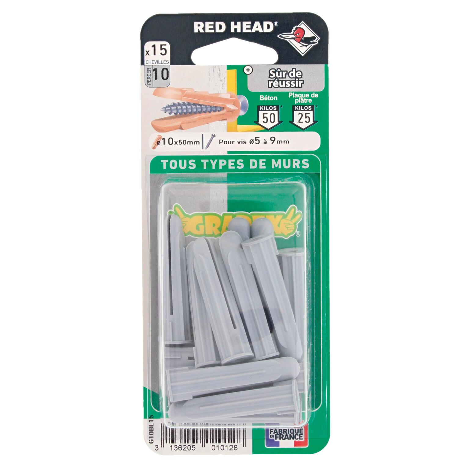 15 grapex d10x50. Cheville crantée qui accepte un large panel de diamètres de vis : du 3 à 5mm pour le diamètre 6 et de 4 à 7mm pour le diamètre 8. Ses ailettes réparties sur tout le corps garantissent un ancrage surperformant. La grapex fonctionne dans tous les types de murs : pleins, creux, y compris la plaque de plâtre. Idéal pour la fixation de luminaires, cadres, petits tableaux, étagères légères, miroirs, interrupteurs, stores d'intérieur, embrasses à rideaux, boîte aux lettres. Fonctionne dans tous les types de murs.