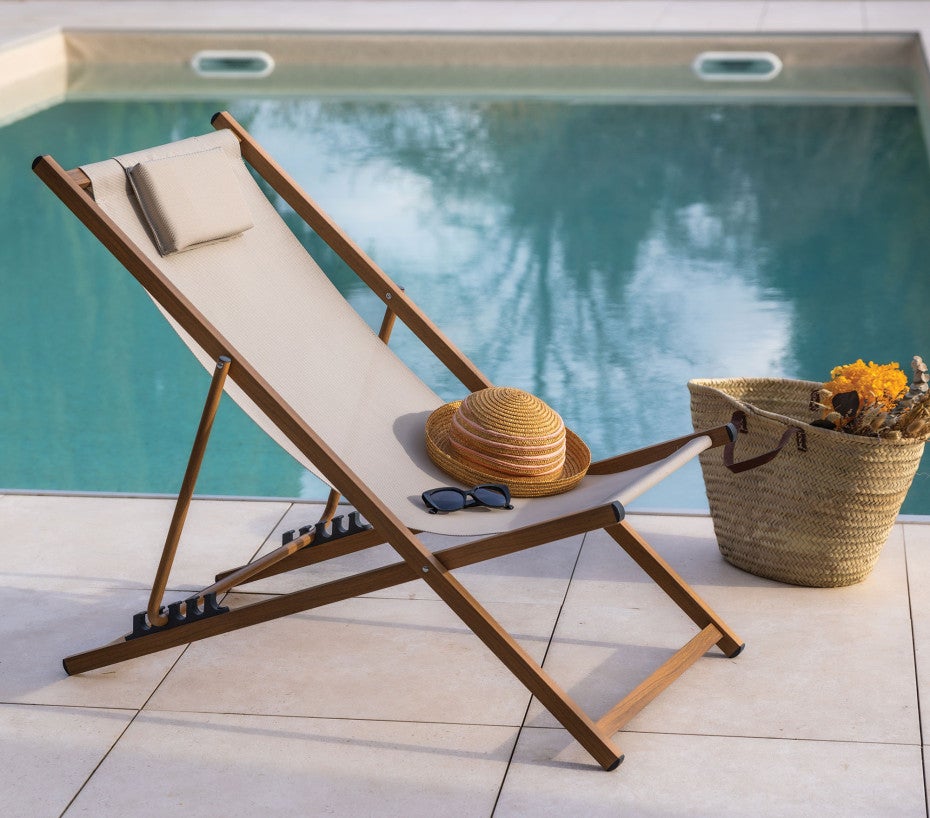 Élégante et discrète, la chilienne PAROS à la structure effet bois et la toile couleur lin trouvera sa place aussi bien sur une terrasse contemporaine qu'au bord d'une piscine ou dans un jardin arboré. Son design épuré et son système pliant en font une assise aussi pratique qu'esthétique pour profiter du soleil en toute sérénité.