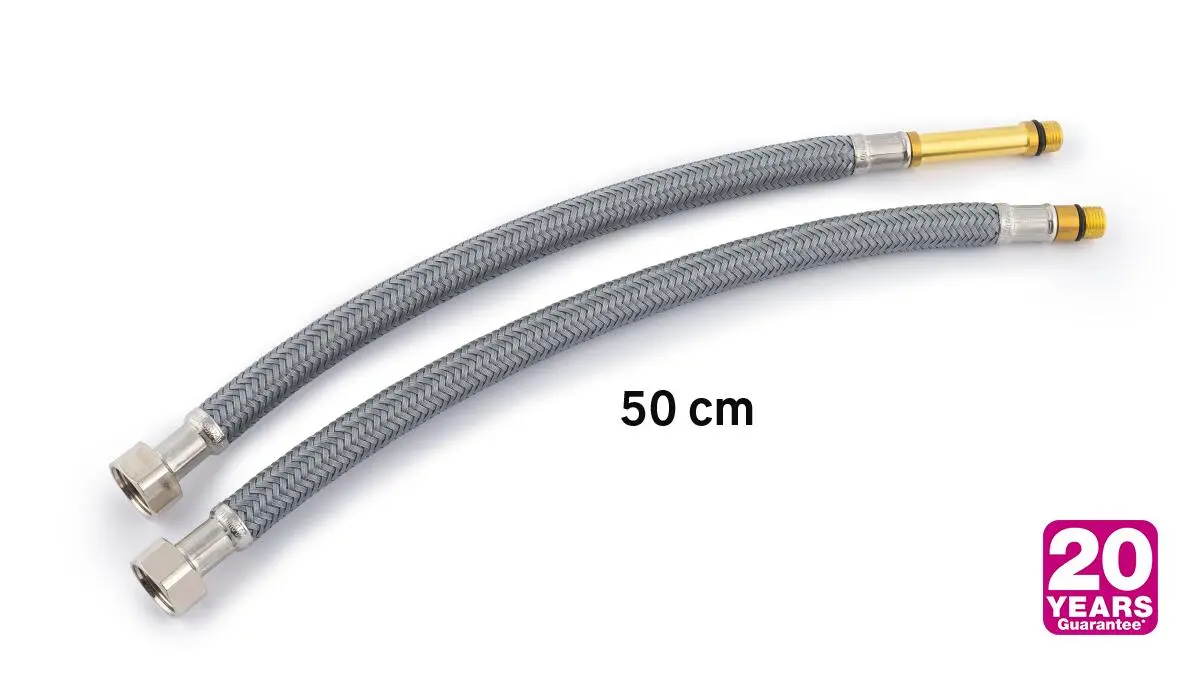 Ce lot de tuyaux flexibles est idéal pour raccorder votre robinetterie au réseau de distribution d'eau. Composé d'un tressage en PET, il sont plus légers, plus maniables et plus résistants à la corrosion. Ils offrent ainsi une garantie de 20 ans. Le matériau intérieur limite la prolifération bactérienne. L'ensemble est certifié ACS (attestation conformité sanitaire). L'écrou libre avec son joint inclus facilite l'installation et le serrage dans les espaces difficiles d'accès sous les vasques et éviers. Flexibles avec tube intérieur annelé, insensibles à la pliure, grande facilité d'installation, débit constant garanti. Résistance totale à la corrosion (eau de javel, produits ménagers de nettoyage, milieux salins); Résistance aux rayons UV avec ses fibres en polymère.