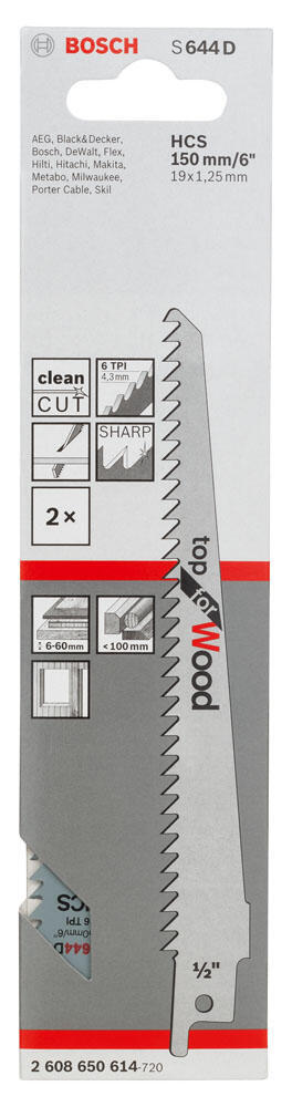Lot de 2 lames de scie sabre pour bois BOSCH PRO S644D, 150 mm