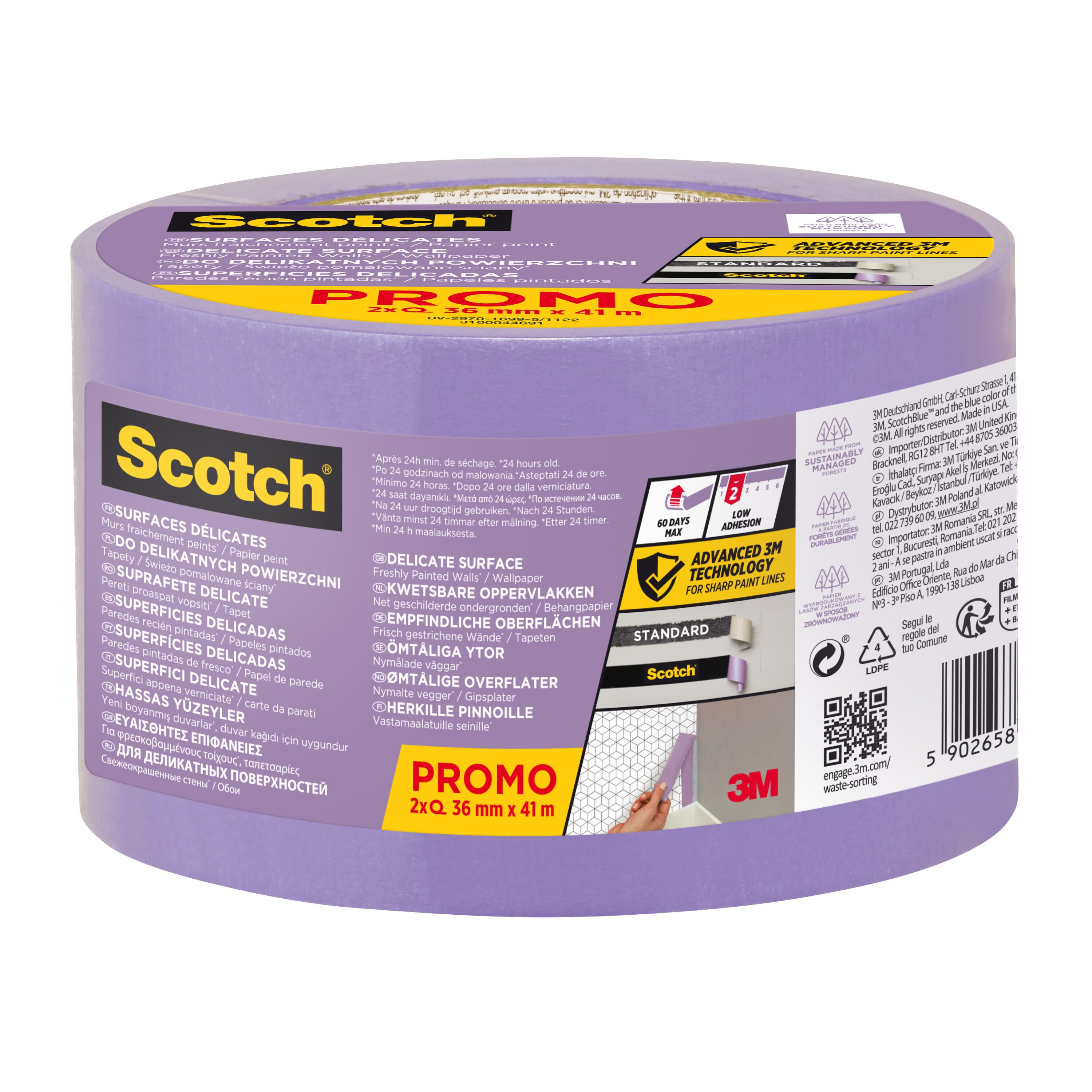 Résistance aux UV. Résistance au transfert de masse. Barrière étanche à la peinture. Retrait sans trace 60 jours. Adapté aux surfaces délicates (murs fraîchement peint, papier peint, meubles). Lignes droites garanties.