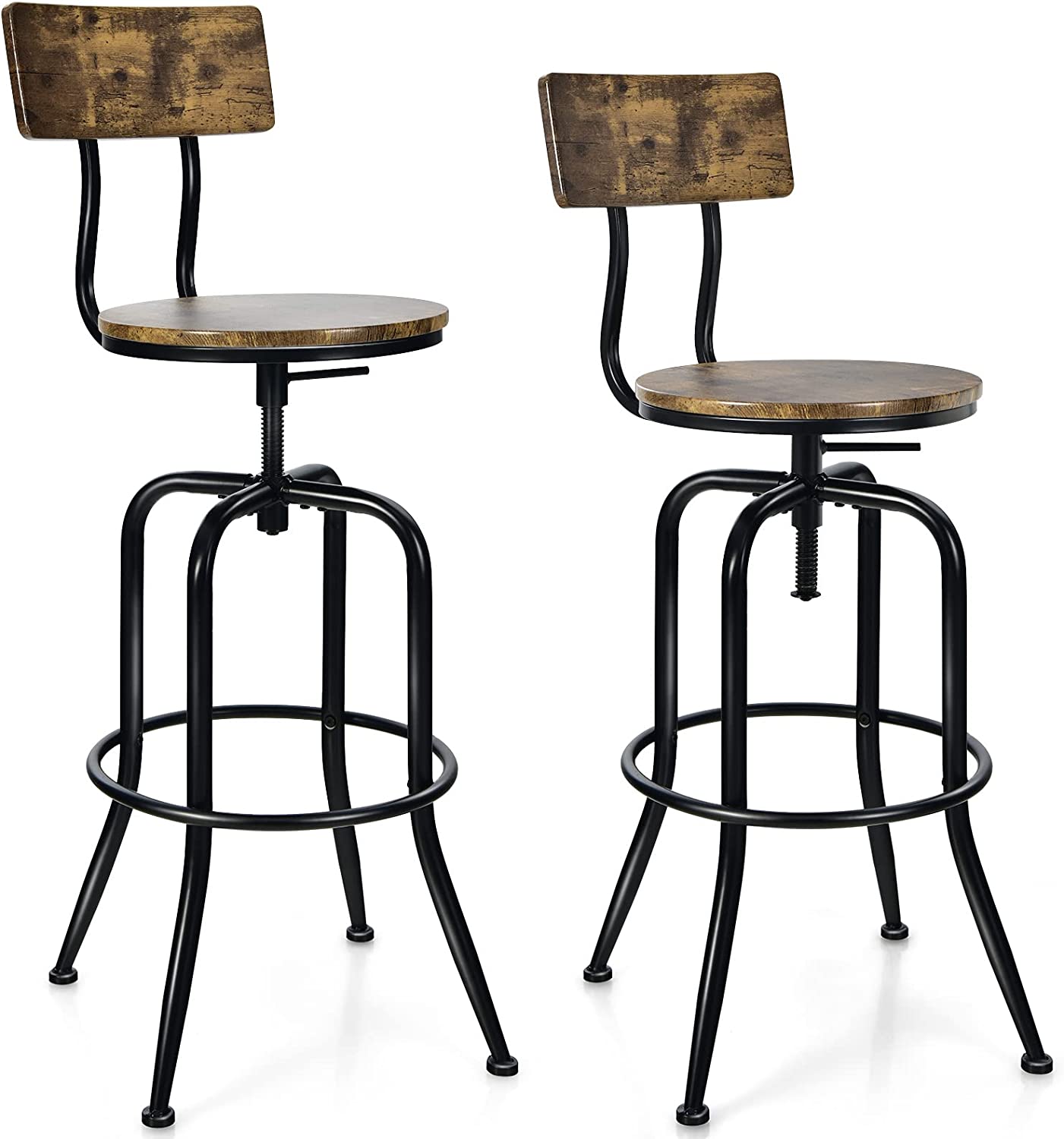 ---- Le système pivotant réglable en hauteur vous permet demodifier la hauteur d'assise de 69 cm à 76 cm, la hauteur de chaise de 98,5 cmà 105,5 cm, parfaitement assortie à votre comptoir ou table de bar. Et ledossier amovible permet aux tabourets de bar dechanger d’aspect, en personnalisant votre propre mobilier d'assiseparfait. Il assure également une conception ergonomique avec dossier incurvé etrepose-pieds pour mieux détendre votre corps. Le grain de bois industriel ramènele style vintage et l’esprit rustique. Ces tabouretsde bar sont stables et fiables avec une structure en croix à l'arrière de labase du siège. Et des pieds en métal avec des patins antidérapants protègentégalement vos sols.