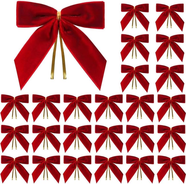 Lot de 24 décorations de Noël pour sapin et maison, nœuds en velours rouge et rubans dorés (rouge)