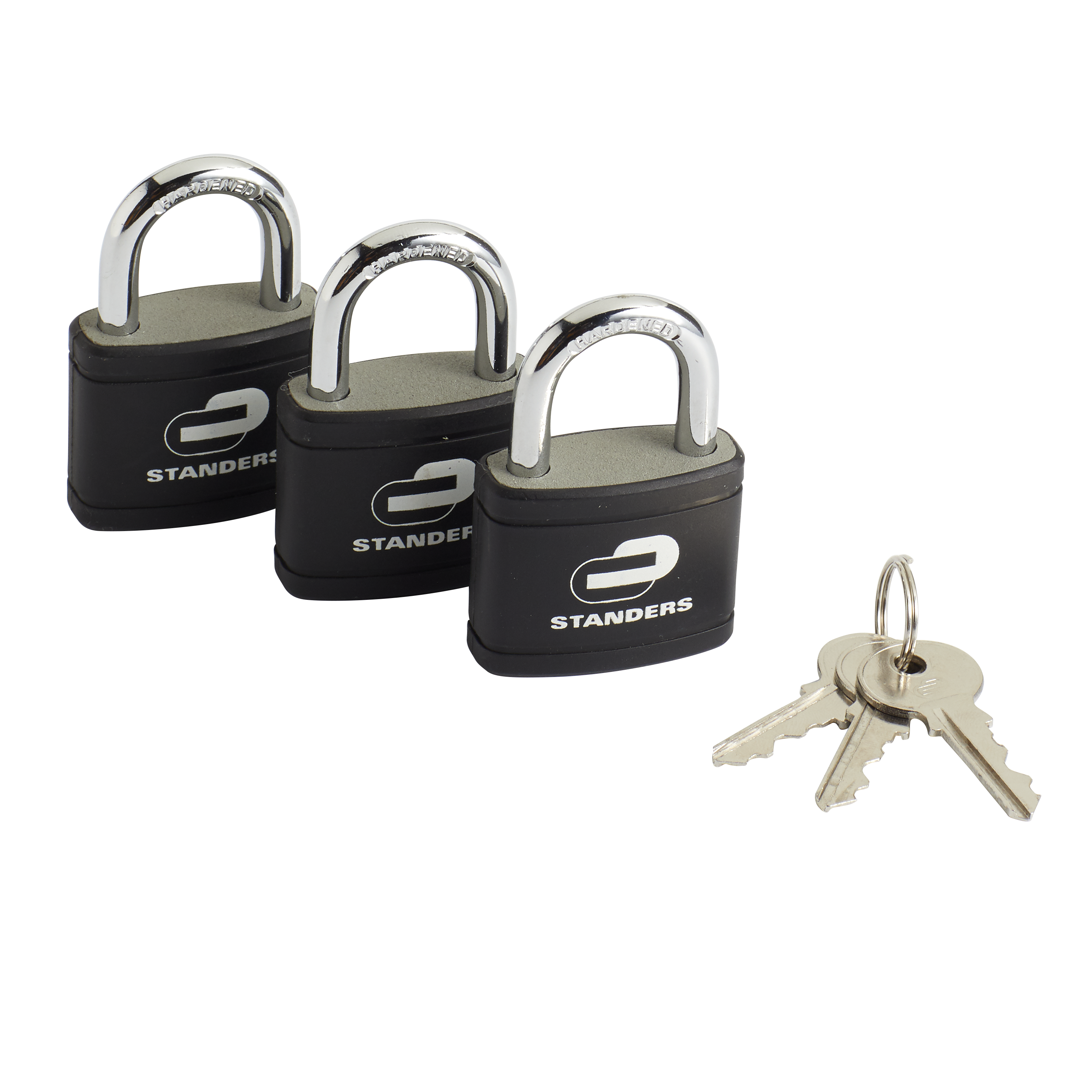 Pack de 3 cadenas avec clé Standers en fer avec finition noire. Offre 3 ans de garantie. Disponible dans d'autres tailles. Dimensions : 41 mm.