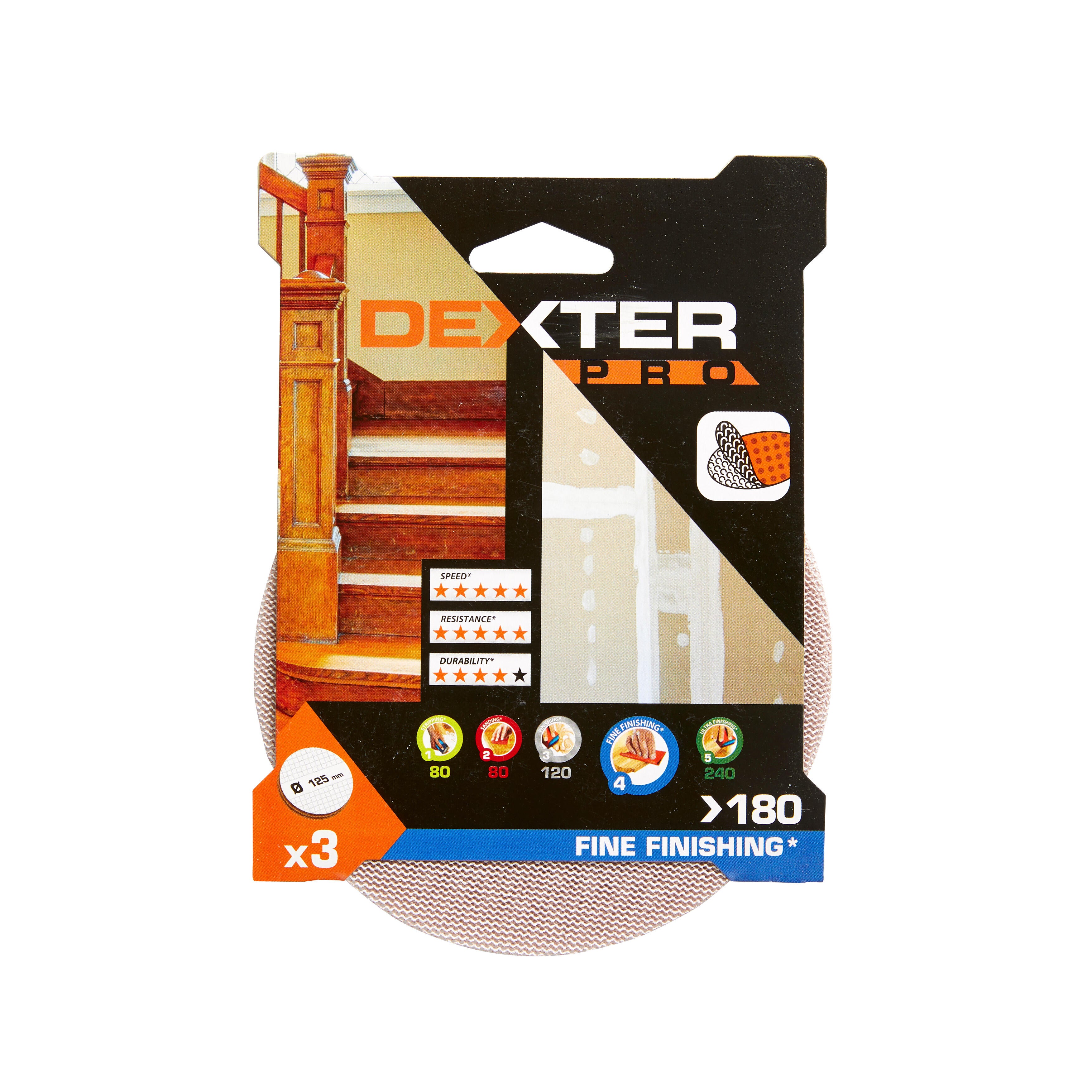 Lot de 3 disques abrasifs, DEXTER PRO, diam 125 mm grain 180