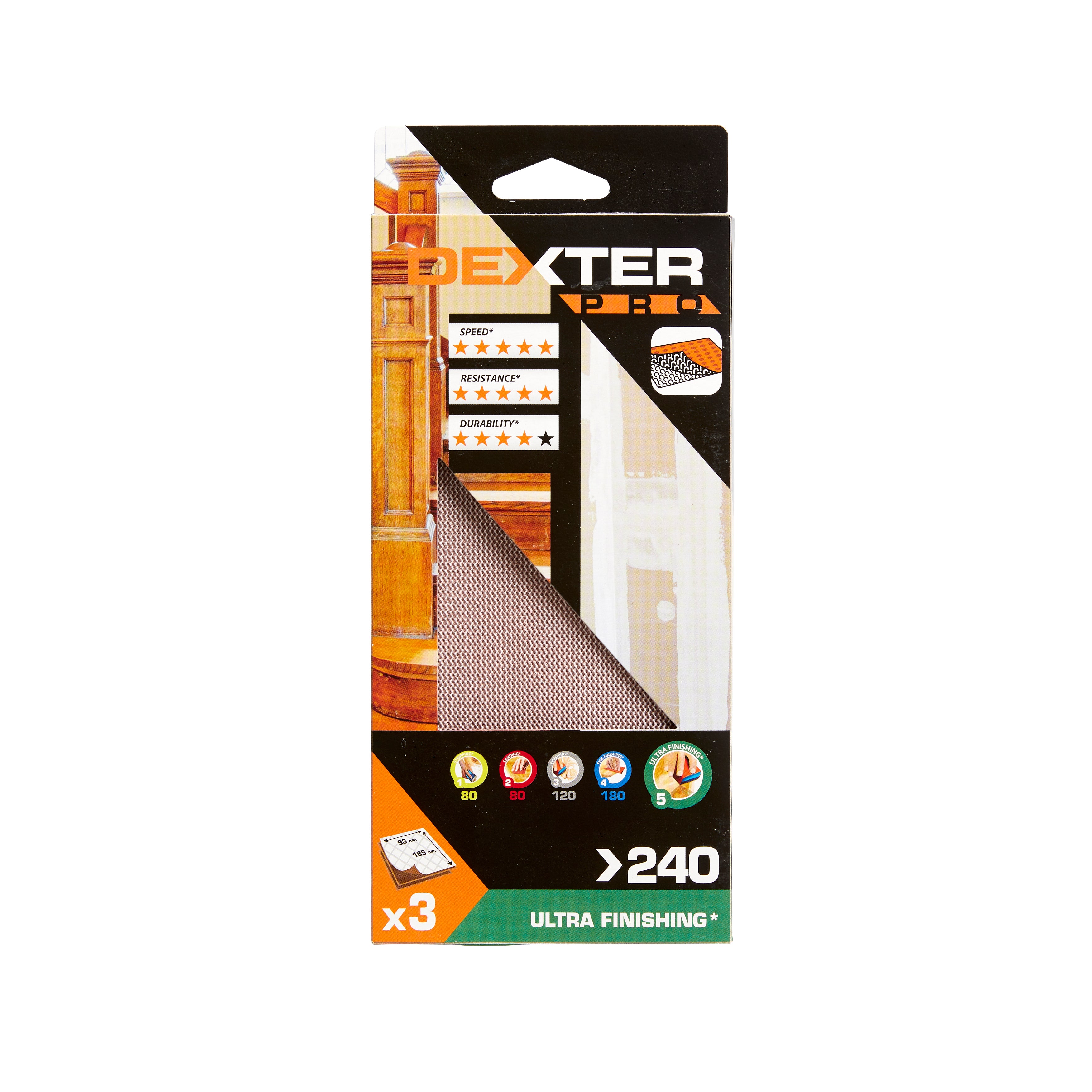 Lot de 3 papiers abrasifs, DEXTER PRO, l.93 x L.185 mm grain 240