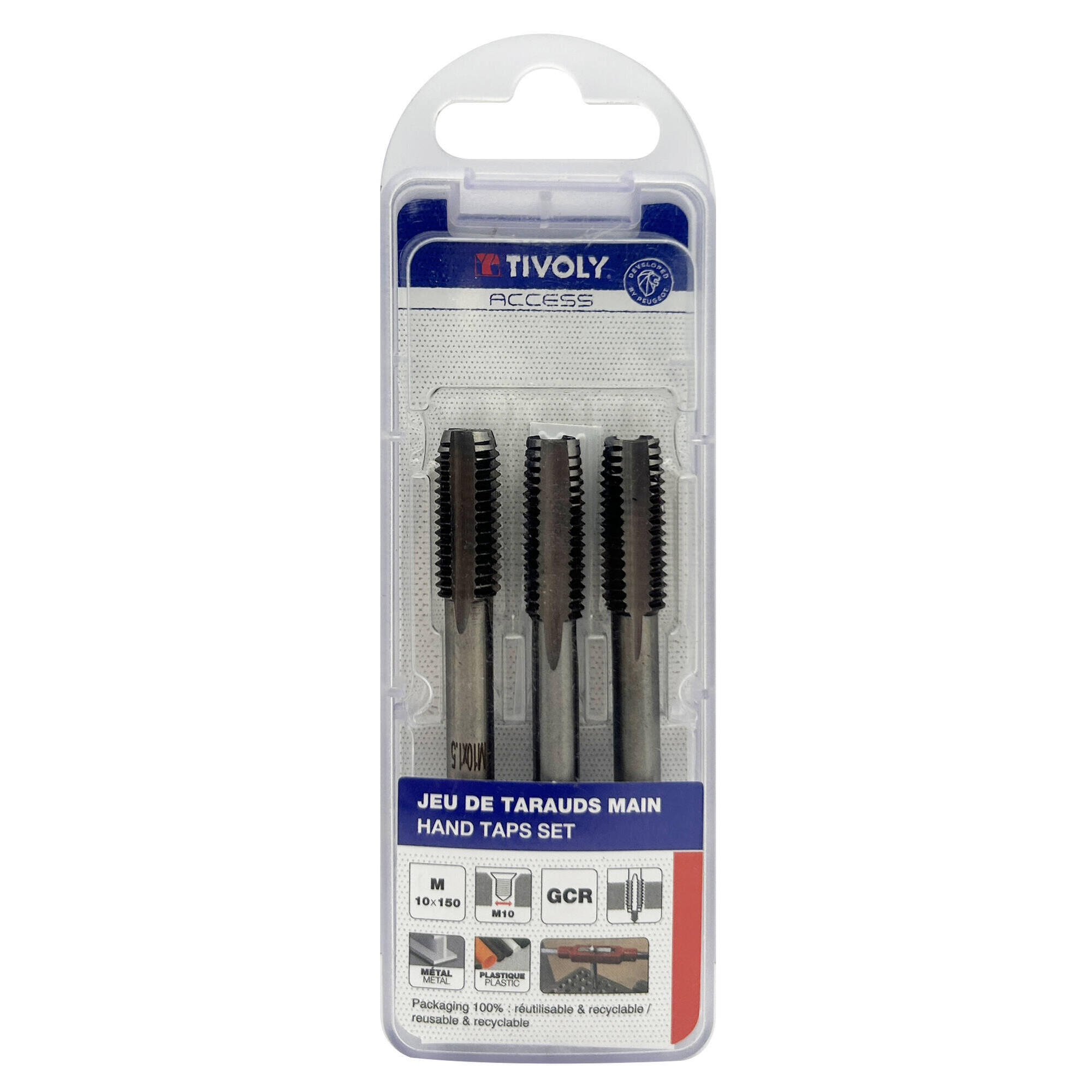 Jeu de 3 tarauds à main (ébaucheur, médian, finisseur), pour le taraudage des aciers doux et des plastiques, à l'aide d'un tourne à gauche ou d'un porte taraud à cliquets. Acier au chrome : Corps conçu à partir d'une nuance d'acier pour traitement thermique. Permet un taraudage et un filetage des métaux tendres et des plastiques.