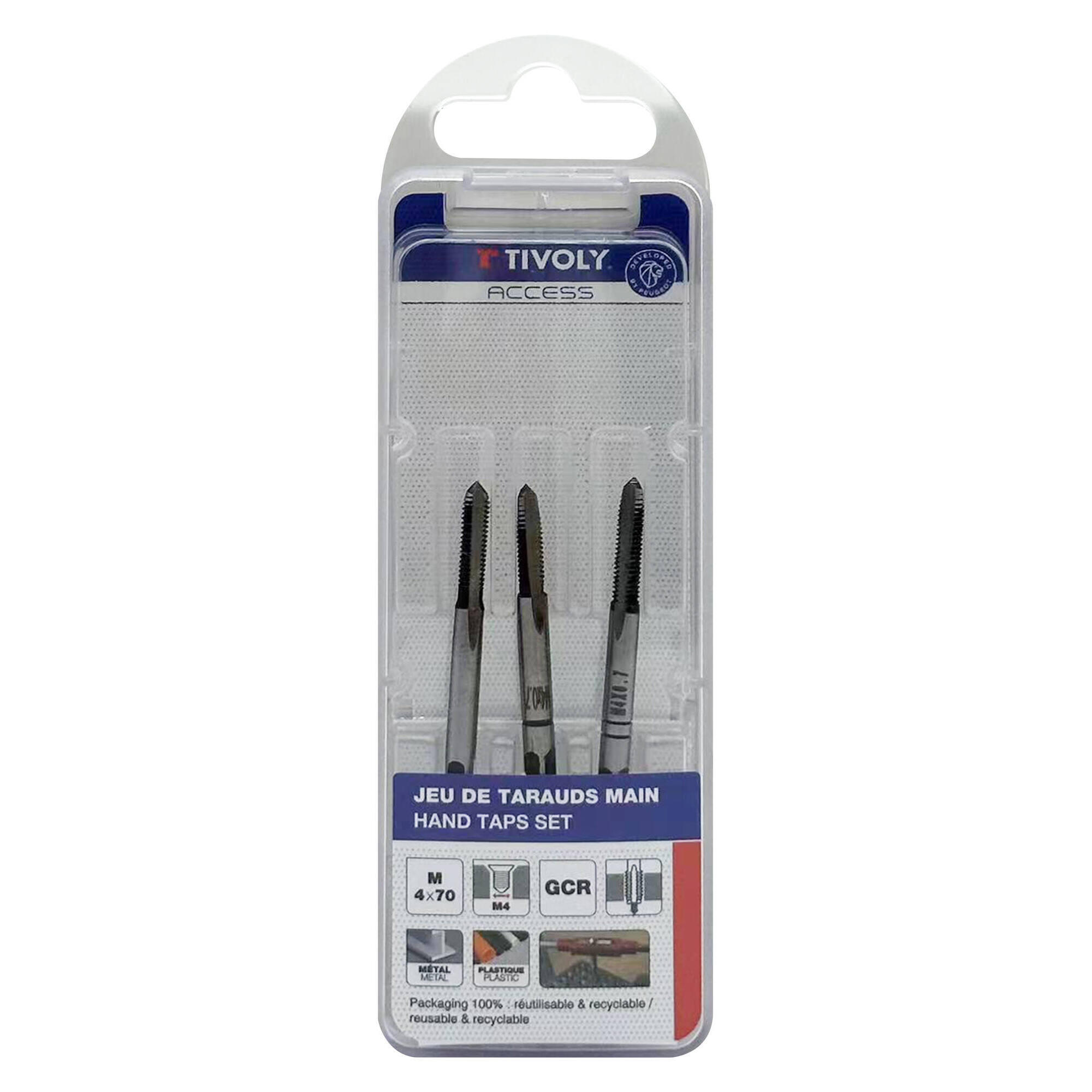 Jeu de 3 tarauds à main (ébaucheur, médian, finisseur), pour le taraudage des aciers doux et des plastiques, à l'aide d'un tourne à gauche ou d'un porte taraud à cliquets. Acier au chrome : Corps conçu à partir d'une nuance d'acier pour traitement thermique. Permet un taraudage et un filetage des métaux tendres et des plastiques.