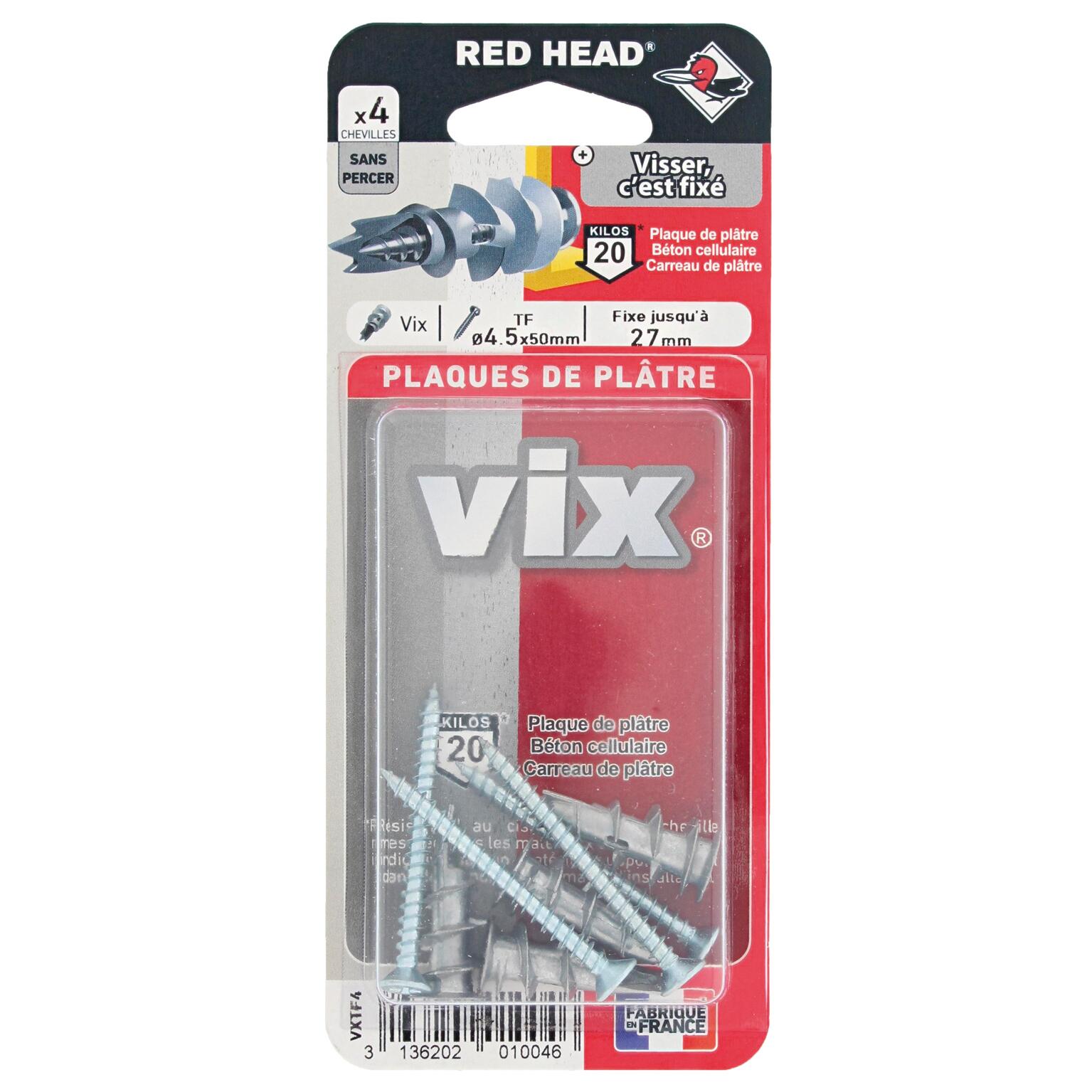 4 vix + vis tf d4,5x50. Cheville en zamak, un alliage métal qui lui permet de résister à la corrosion.la cheville se visse directement dans la plaque de plâtre. Son filetage progressif est breveté et garantit une fixation propre qui ne créé pas d'accumulation de plâtre lors du perçage. Idéal pour la fixation de convecteurs, étagères, accessoires de salle de bain, cadres, miroirs, luminaires, armoires à pharmacie...