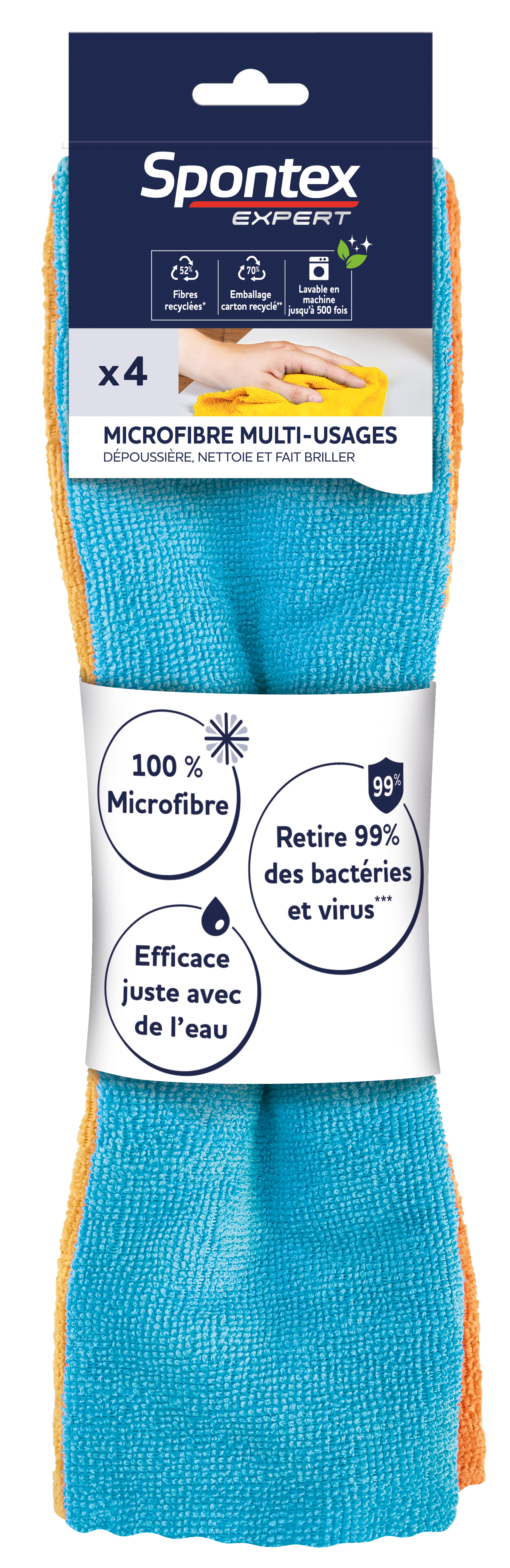 Grâce à leurs fibres 100 fois plus fines qu'un cheveu, les microfibres Spontex Expert sont ultra efficaces. Leur extraordinaire pouvoir nettoyant leur permettent de capturer plus de 99% des bactéries et virus présents sur les surfaces sans aucun détergent ! Ultra résistantes et efficaces, elles peuvent être lavées en machine non pas une fois mais jusqu'à 500 fois, permettant de l'utiliser encore et encore. Recyclez vos lavettes microfibres grâce à notre partenariat avec Refashion. Pour en savoir plus rendez-vous sur refashion.fr