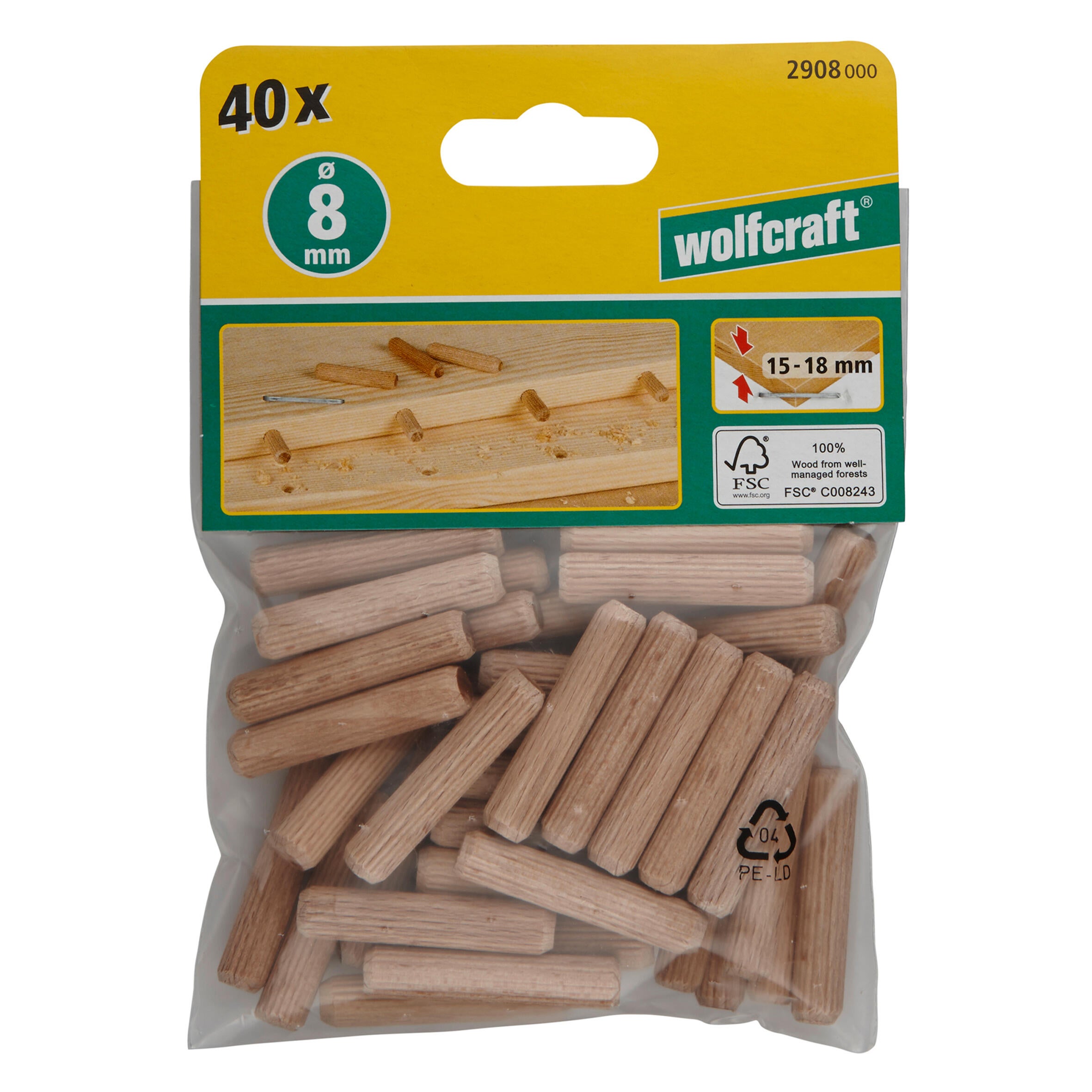 Les tourillons de wolfcraft sont fabriqués en bois de hêtre sec, selon la norme DIN 68150. Ils sont compatibles avec le kit de tourillons universel (3750000), le guide d'assemblage bois à main levée universel (4640000), le coffret de tourillons universel (4645000) et le guide d'assemblage bois en série (4650000) de wolfcraft. La structure de surface rainurée vous procure une tenue optimale dans le trou d’assemblage, vous assemblez ainsi votre pièce de manière fiable avec de la colle. Le chanfrein présent sur chacun des côtés extérieurs garantit la répartition optimale de la colle.