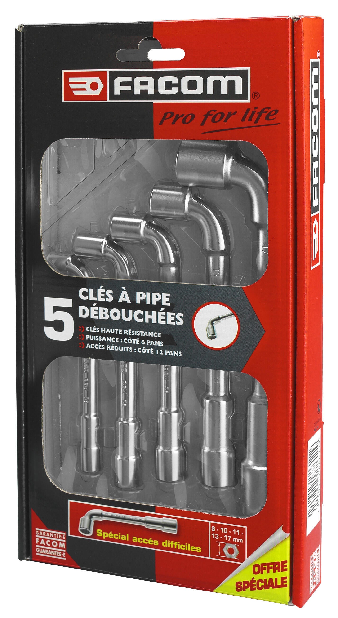 Coffret de 5 Clés à pipe débouchées - 1 profil différent à chaque côté : profil 12 pans pour reprise diminuée profil 6 pans pour puissance et résistance - Ouverture : 8 - 10 - 11 - 13 et 17 mm - Protection des angles de l'écrou.