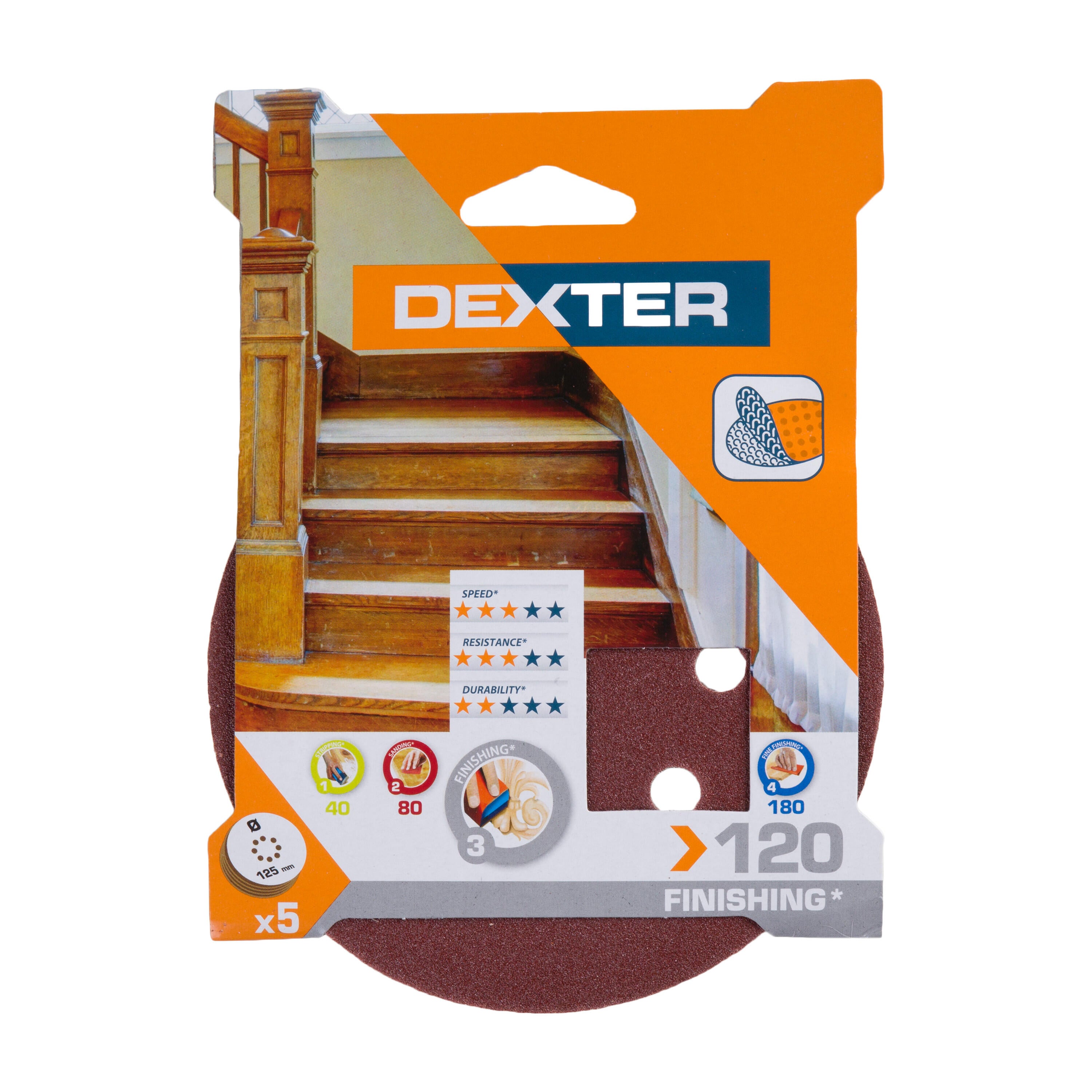 Lot de 5 abrasifs Dexter grain 120, Ø125 mm adapté aux ponceuses excentriques. Fixation facile à la machine au moyen d'une bande velcro.