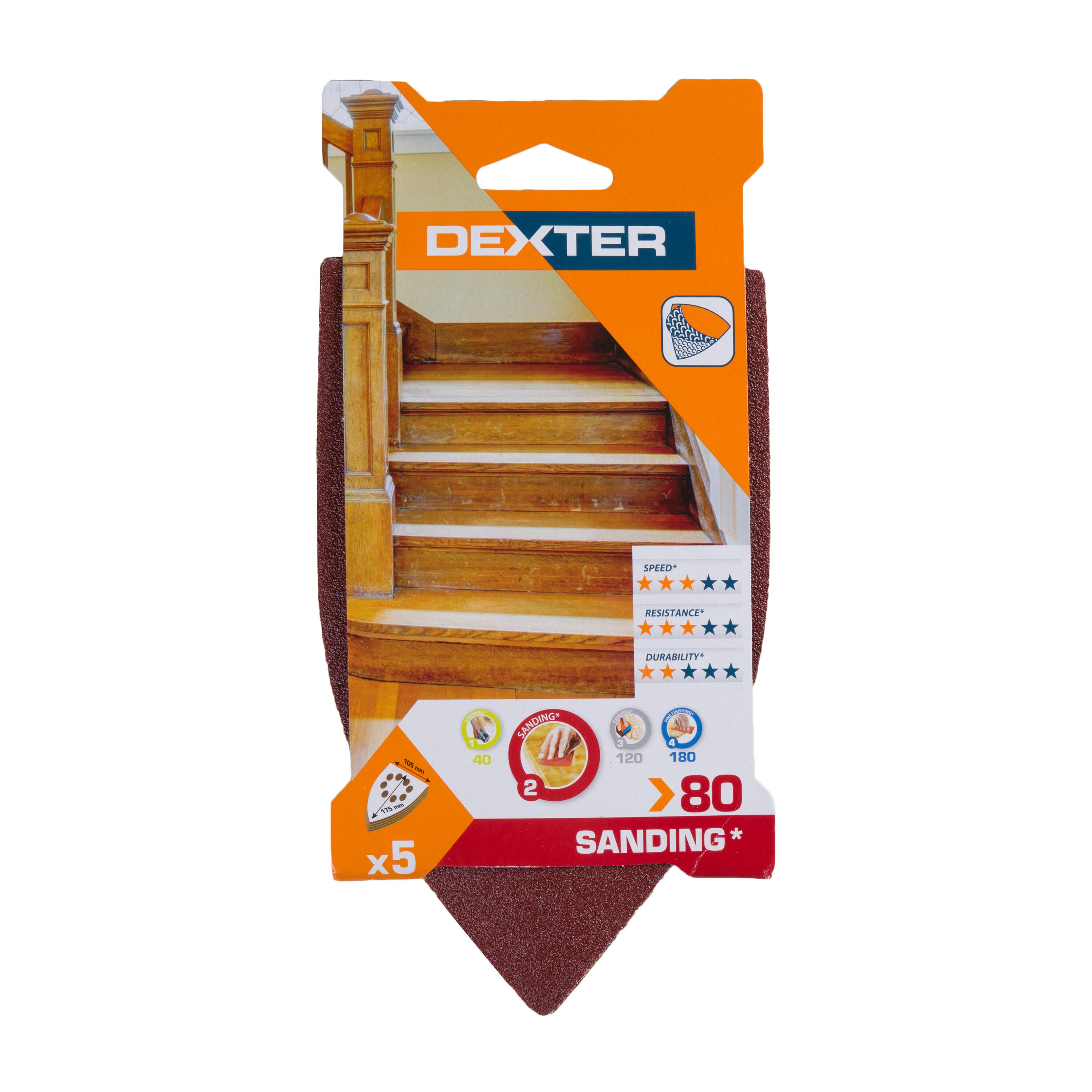 Lot de 5 papiers abrasifs delta triangulaire, DEXTER, l.105 x L.175 mm grain 80